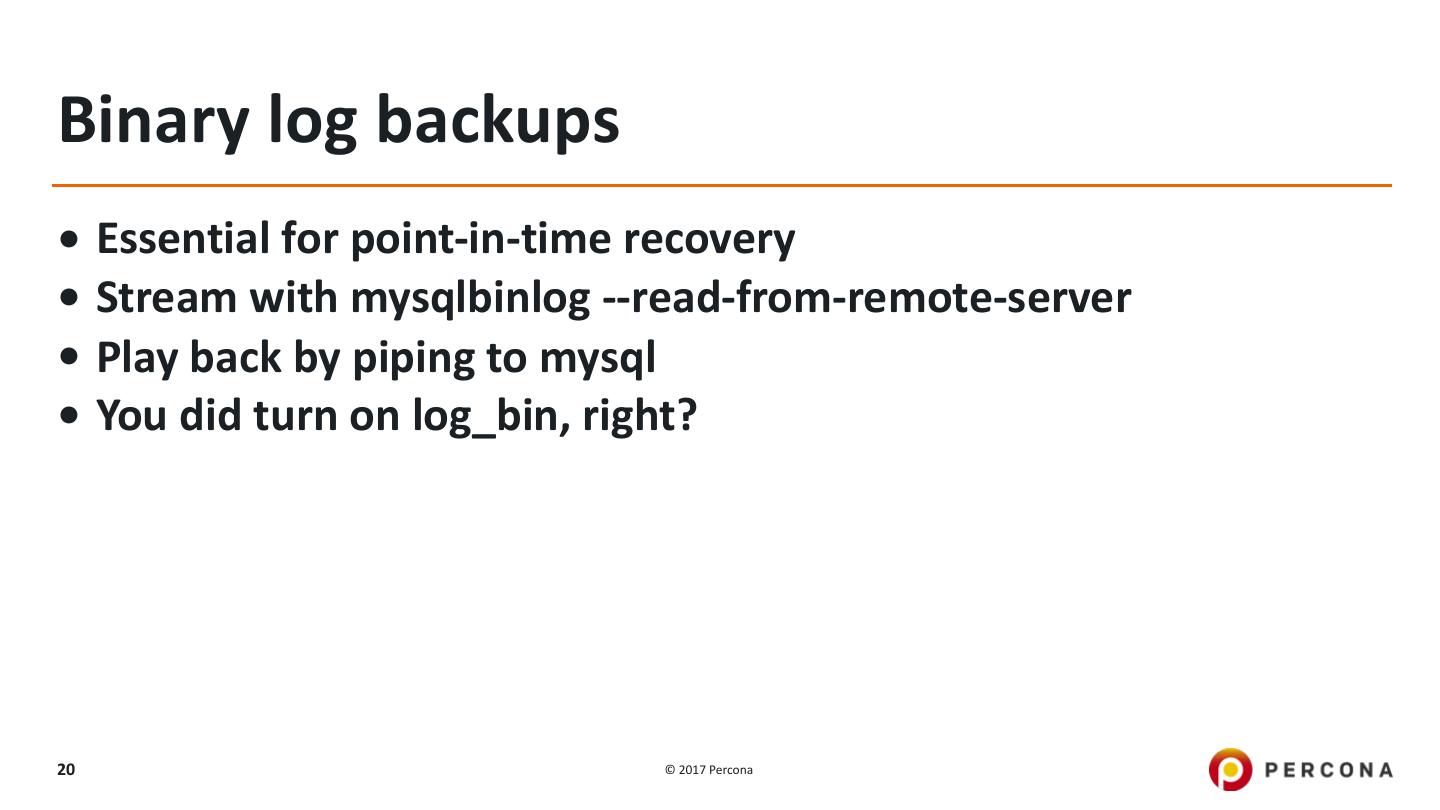 20 .Binary log backups • Essential for point-in-time recovery • Stream with mysqlbinlog --read-from-remote-server • Play back by piping to mysql • You did turn on log_bin, right? 20 © 2017 Percona