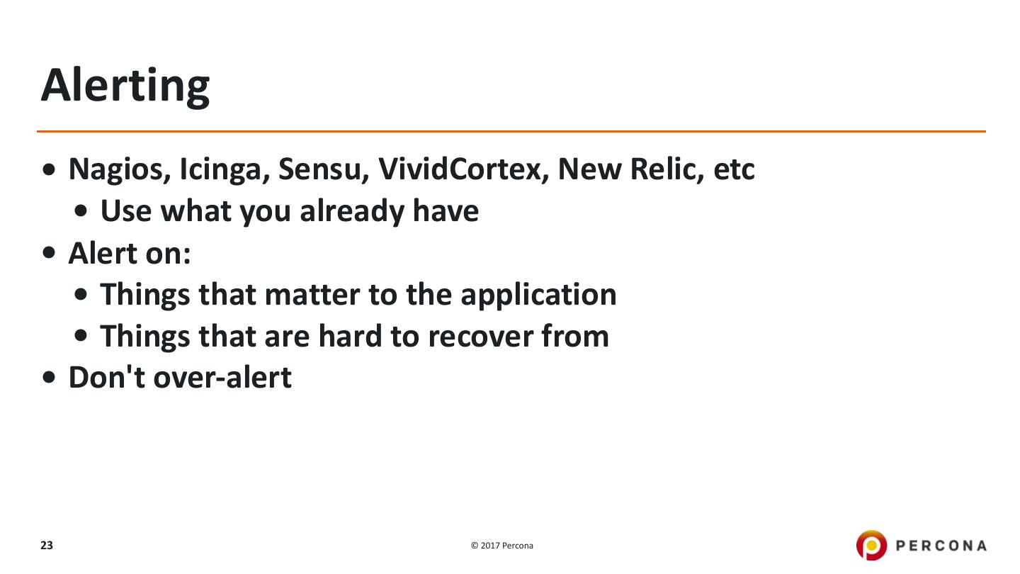 23 .Alerting • Nagios, Icinga, Sensu, VividCortex, New Relic, etc • Use what you already have • Alert on: • Things that matter to the application • Things that are hard to recover from • Don't over-alert 23 © 2017 Percona