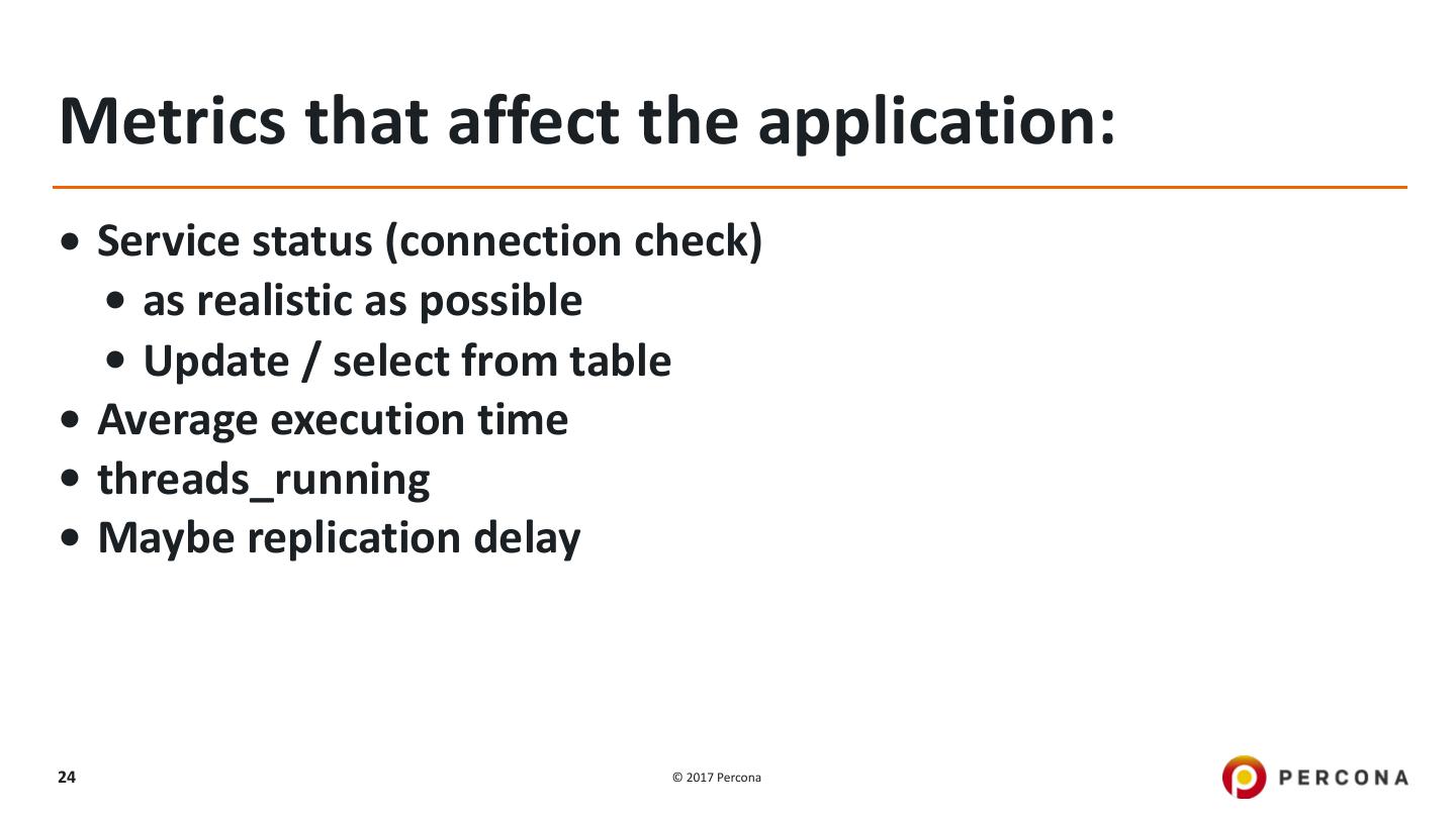 24 .Metrics that affect the application: • Service status (connection check) • as realistic as possible • Update / select from table • Average execution time • threads_running • Maybe replication delay 24 © 2017 Percona
