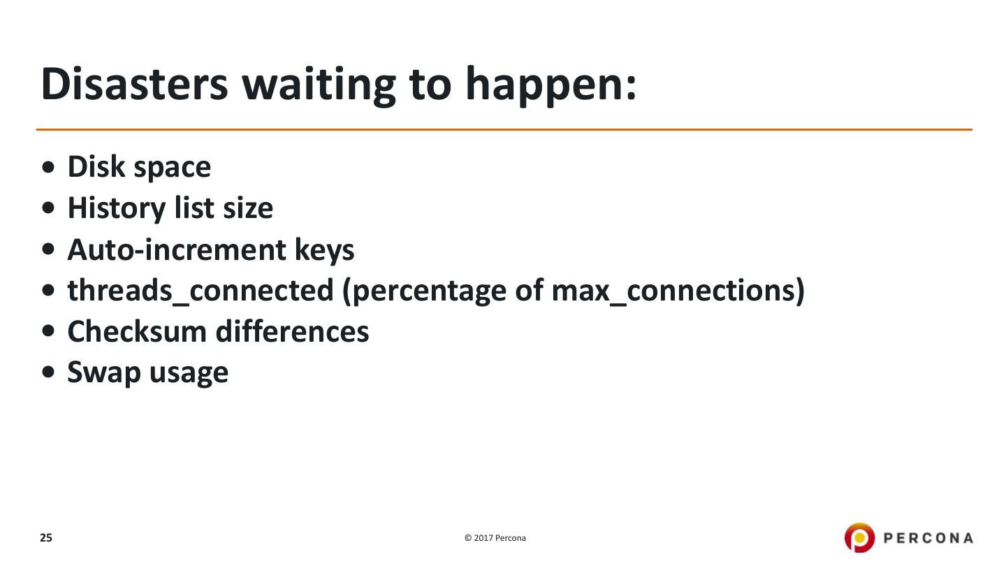 25 .Disasters waiting to happen: • Disk space • History list size • Auto-increment keys • threads_connected (percentage of max_connections) • Checksum differences • Swap usage 25 © 2017 Percona
