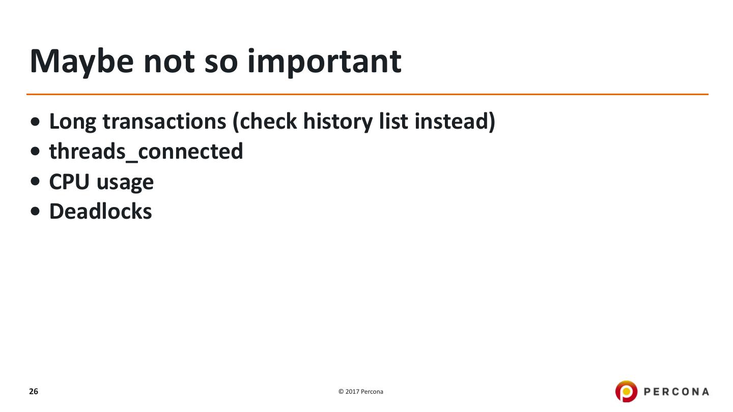 26 .Maybe not so important • Long transactions (check history list instead) • threads_connected • CPU usage • Deadlocks 26 © 2017 Percona