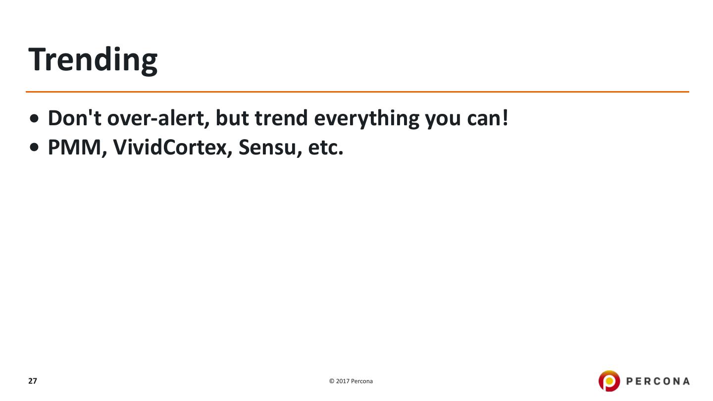 27 .Trending • Don't over-alert, but trend everything you can! • PMM, VividCortex, Sensu, etc. 27 © 2017 Percona