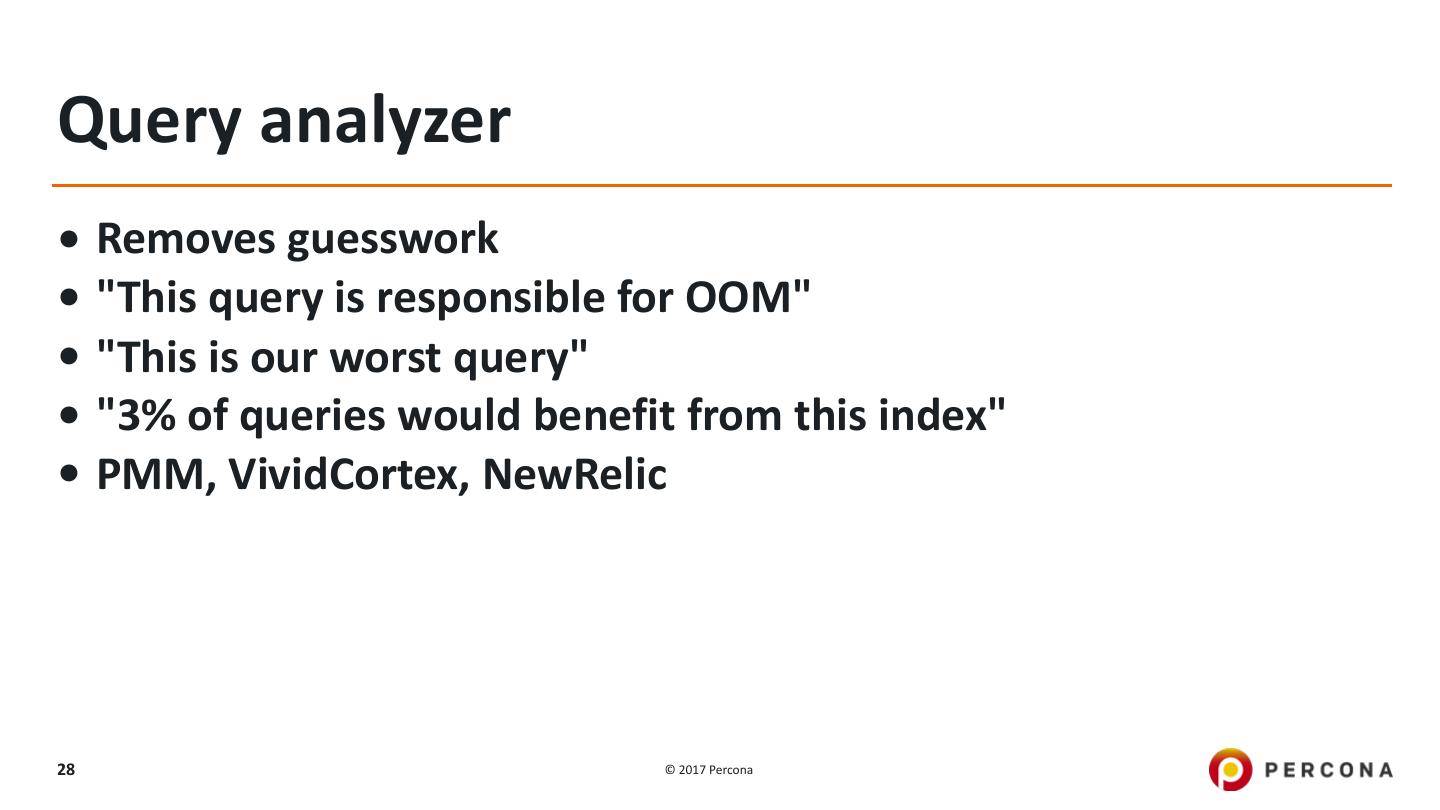 28 .Query analyzer • Removes guesswork • "This query is responsible for OOM" • "This is our worst query" • "3% of queries would benefit from this index" • PMM, VividCortex, NewRelic 28 © 2017 Percona