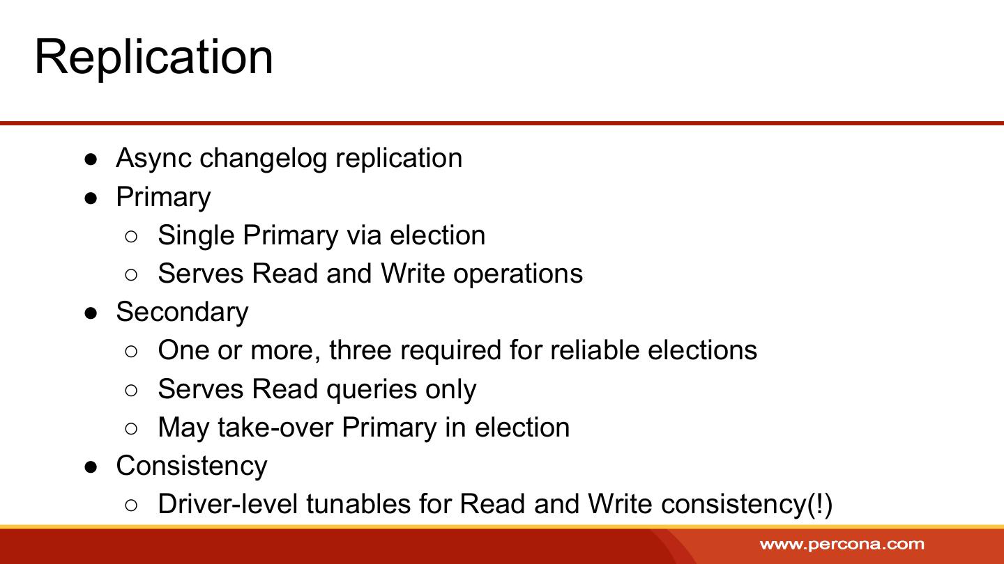 11 .Replication ● Async changelog replication ● Primary ○ Single Primary via election ○ Serves Read and Write operations ● Secondary ○ One or more, three required for reliable elections ○ Serves Read queries only ○ May take-over Primary in election ● Consistency ○ Driver-level tunables for Read and Write consistency(!)