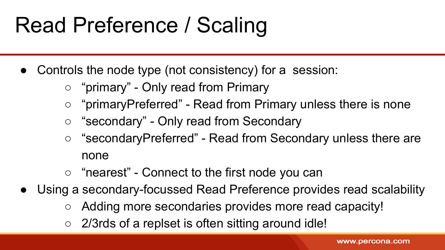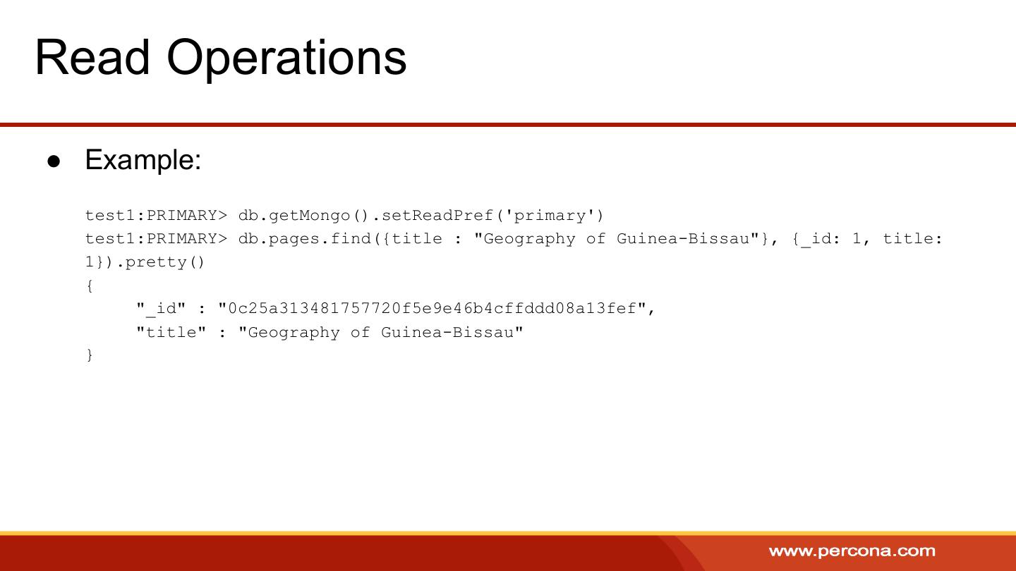 17 .Read Operations ● Example: test1:PRIMARY> db.getMongo().setReadPref('primary') test1:PRIMARY> db.pages.find({title : "Geography of Guinea-Bissau"}, {_id: 1, title: 1}).pretty() { "_id" : "0c25a313481757720f5e9e46b4cffddd08a13fef", "title" : "Geography of Guinea-Bissau" }