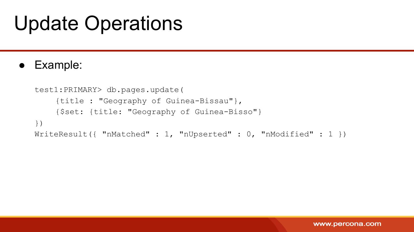 20 .Update Operations ● Example: test1:PRIMARY> db.pages.update( {title : "Geography of Guinea-Bissau"}, {$set: {title: "Geography of Guinea-Bisso"} }) WriteResult({ "nMatched" : 1, "nUpserted" : 0, "nModified" : 1 })