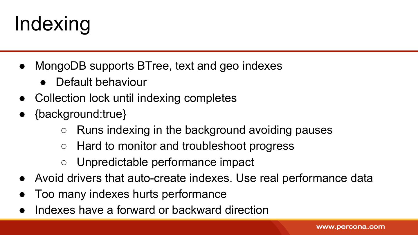 24 .Indexing ● MongoDB supports BTree, text and geo indexes ● Default behaviour ● Collection lock until indexing completes ● {background:true} ○ Runs indexing in the background avoiding pauses ○ Hard to monitor and troubleshoot progress ○ Unpredictable performance impact ● Avoid drivers that auto-create indexes. Use real performance data ● Too many indexes hurts performance ● Indexes have a forward or backward direction