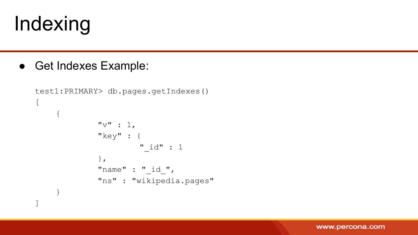26 .Indexing ● Get Indexes Example: test1:PRIMARY> db.pages.getIndexes() [ { "v" : 1, "key" : { "_id" : 1 }, "name" : "_id_", "ns" : "wikipedia.pages" } ]