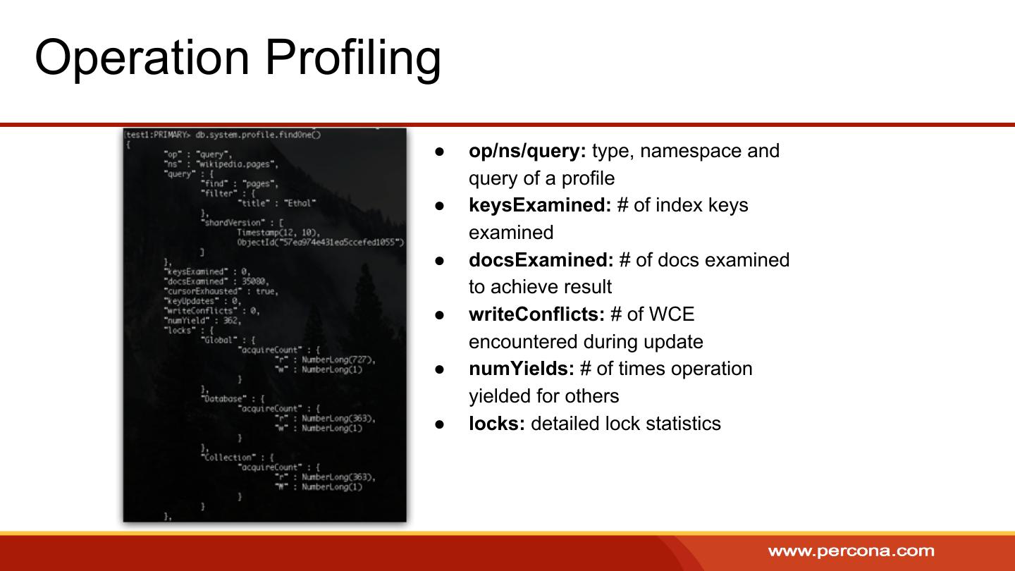 28 .Operation Profiling ● op/ns/query: type, namespace and query of a profile ● keysExamined: # of index keys examined ● docsExamined: # of docs examined to achieve result ● writeConflicts: # of WCE encountered during update ● numYields: # of times operation yielded for others ● locks: detailed lock statistics