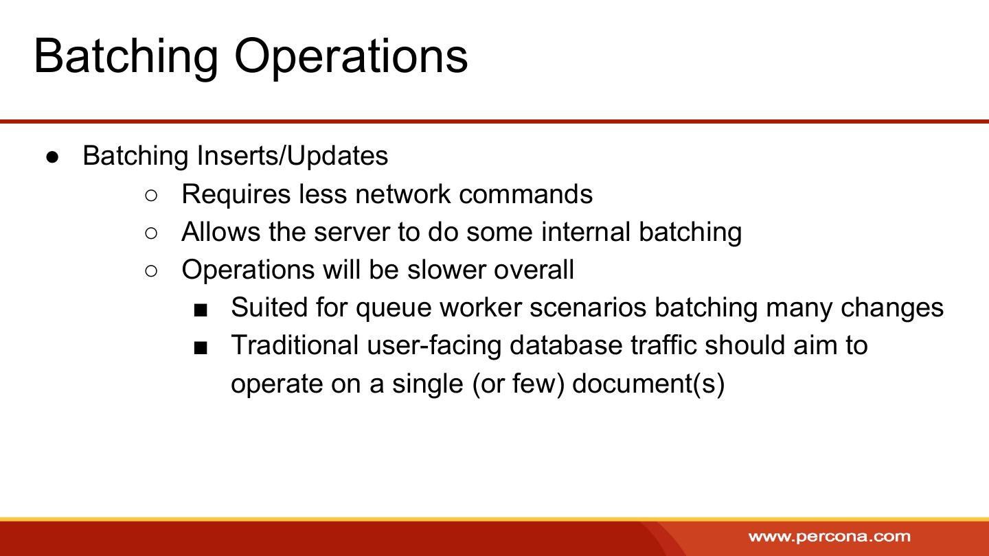 12 .Insert Operations ● A Single-document Insert triggers: ○ 1 x append to the journal ○ 1 x document to be added to the data file(s) ○ MMAPv1 Considerations ■ MMAP will scan for a free slot for the insert ■ Shown as the “nmoved” metric ● Multi-document Insert Operations ○ Can be used to batch inserts ○ Improves insert performance in many cases ○ Can be ordered <true/false> in options document