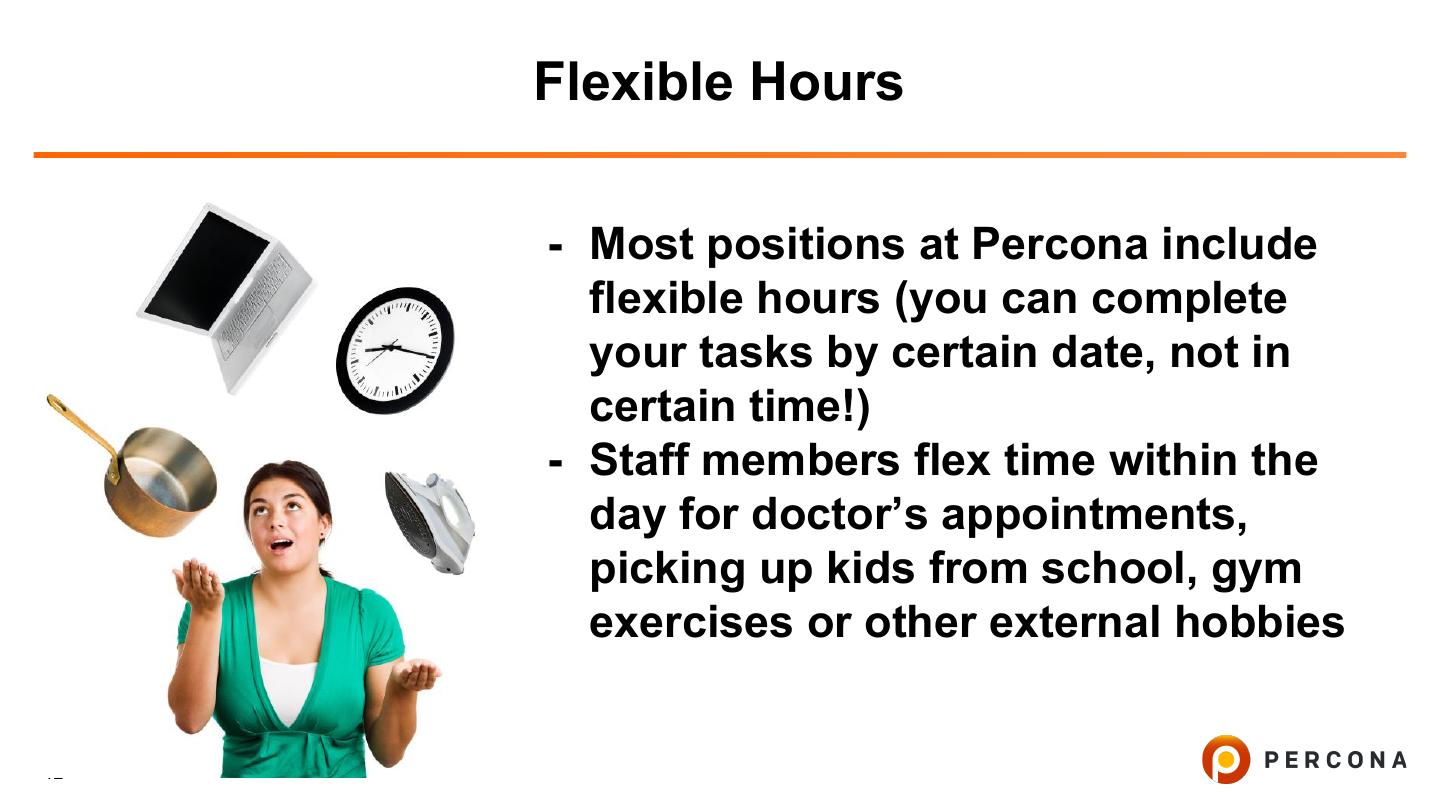 12 . Flexible Hours - Most positions at Percona include flexible hours (you can complete your tasks by certain date, not in certain time!) - Staff members flex time within the day for doctor’s appointments, picking up kids from school, gym exercises or other external hobbies 12