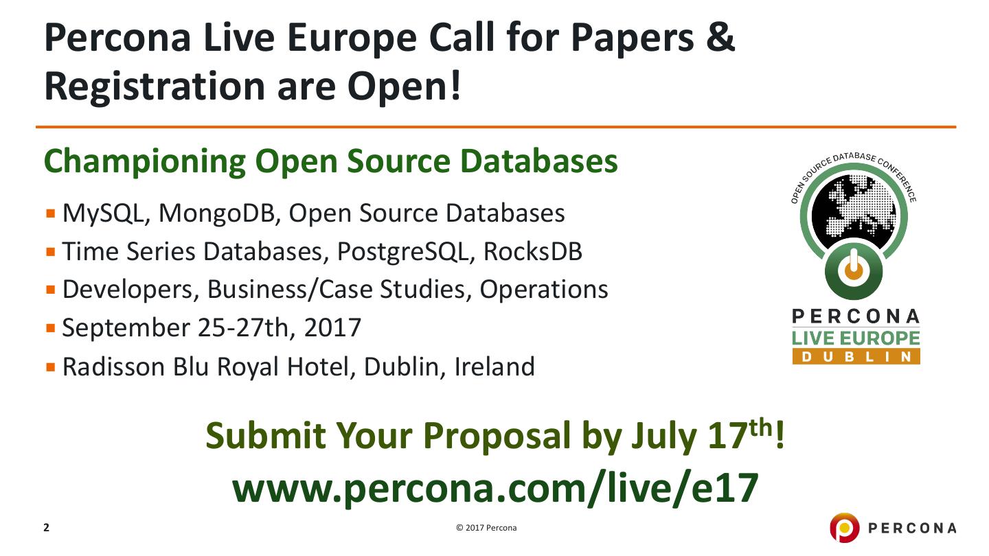 2 .Percona Live Europe Call for Papers & Registration are Open! Championing Open Source Databases ▪ MySQL, MongoDB, Open Source Databases ▪ Time Series Databases, PostgreSQL, RocksDB ▪ Developers, Business/Case Studies, Operations ▪ September 25-27th, 2017 ▪ Radisson Blu Royal Hotel, Dublin, Ireland Submit Your Proposal by July 17th! www.percona.com/live/e17 2 © 2017 Percona