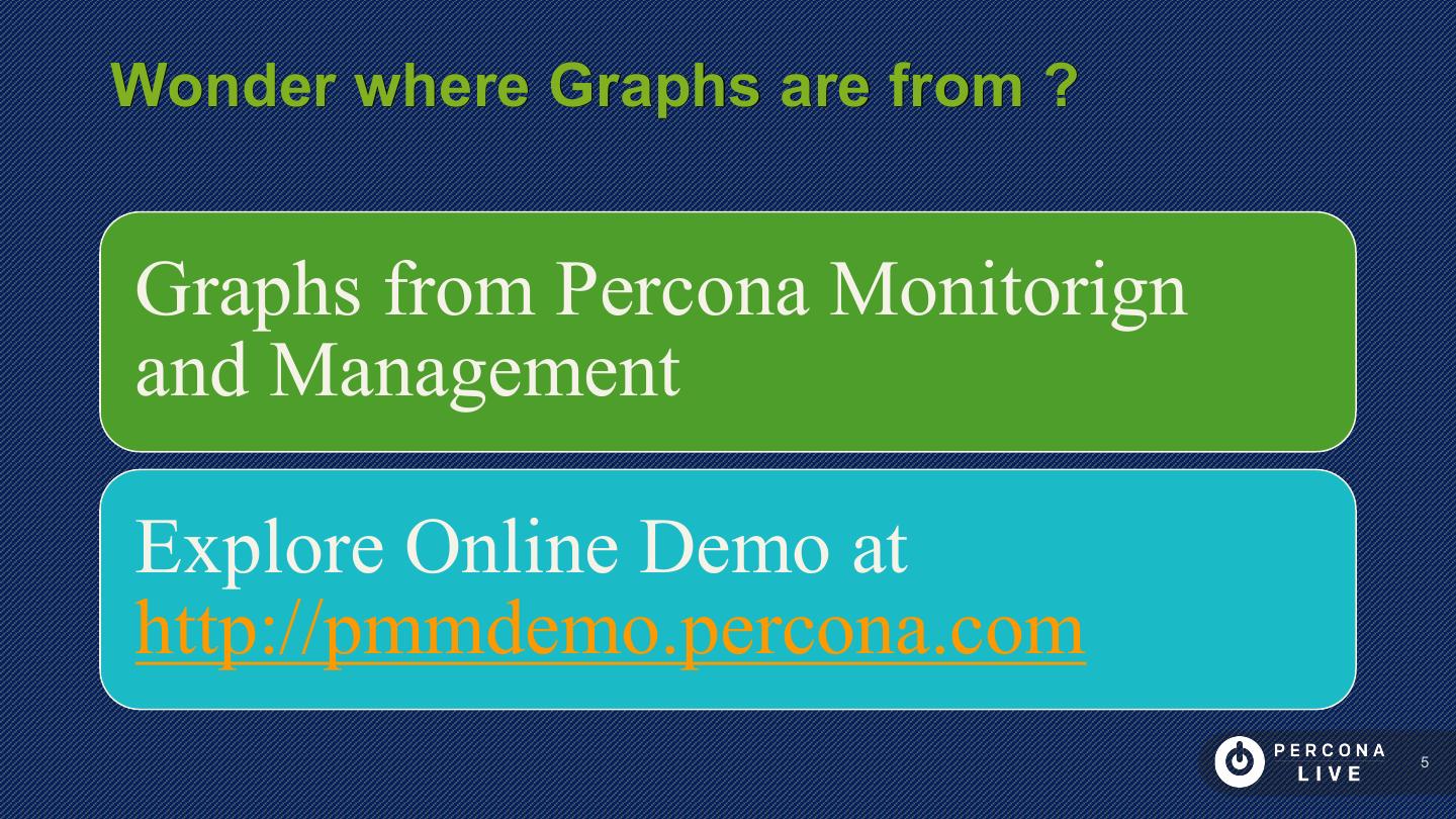 5 .Wonder where Graphs are from ? Graphs from Percona Monitorign and Management Explore Online Demo at http://pmmdemo.percona.com 5