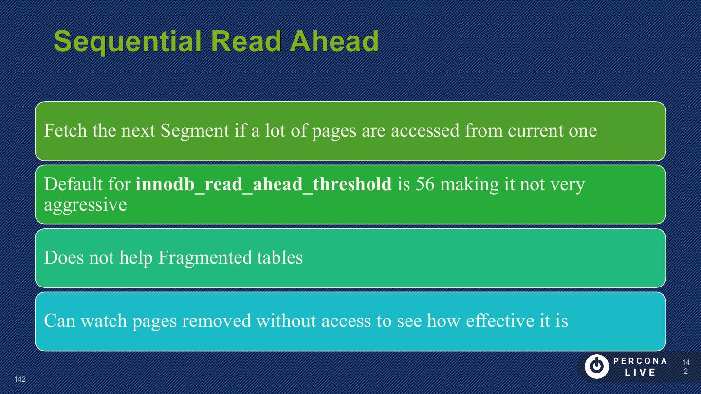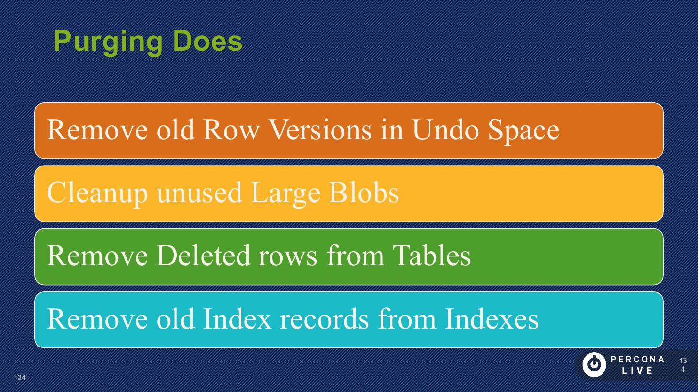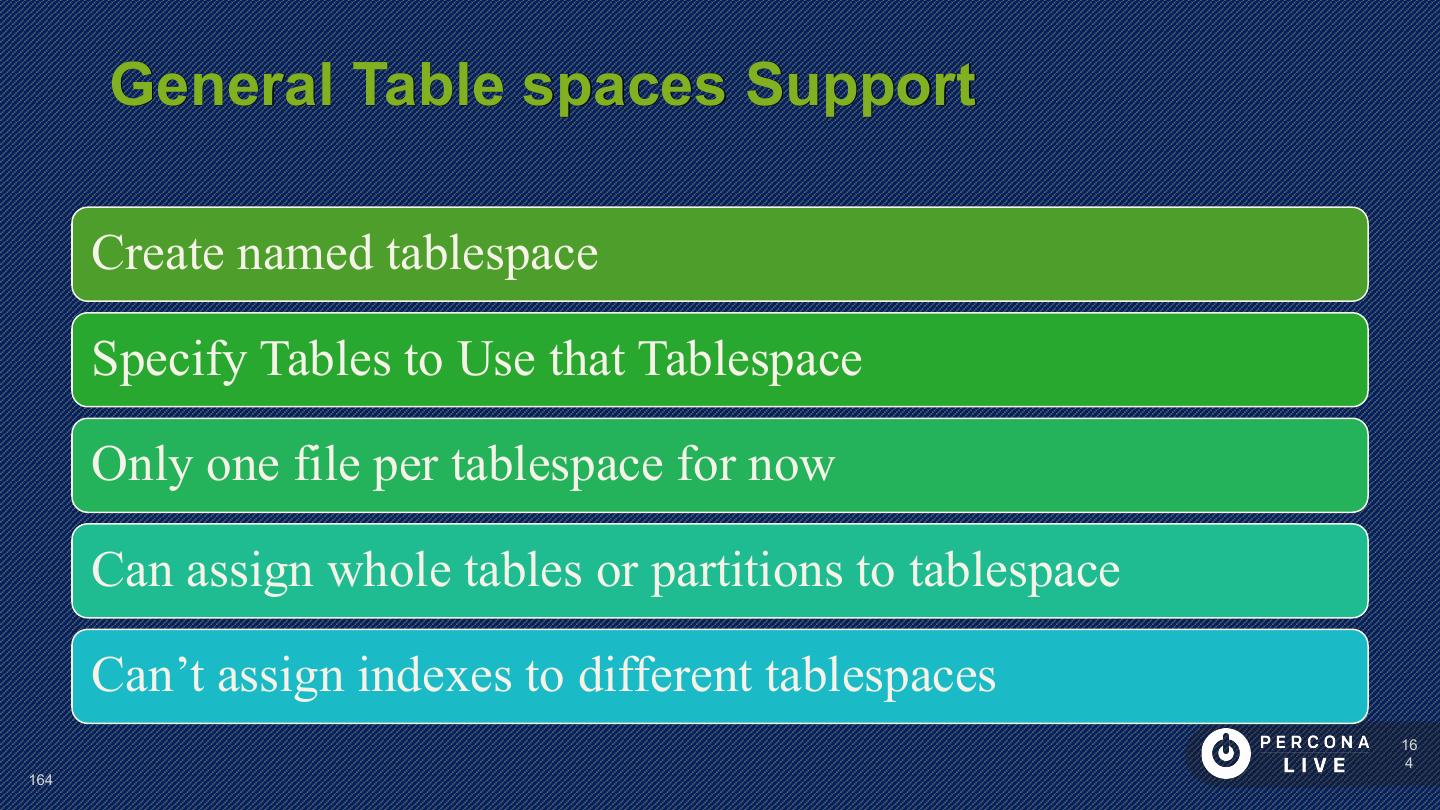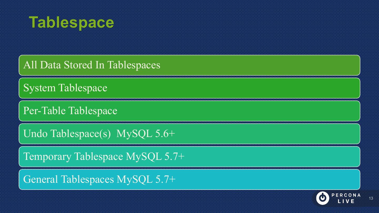 13 . Tablespace All Data Stored In Tablespaces System Tablespace Per-Table Tablespace Undo Tablespace(s) MySQL 5.6+ Temporary Tablespace MySQL 5.7+ General Tablespaces MySQL 5.7+ 13