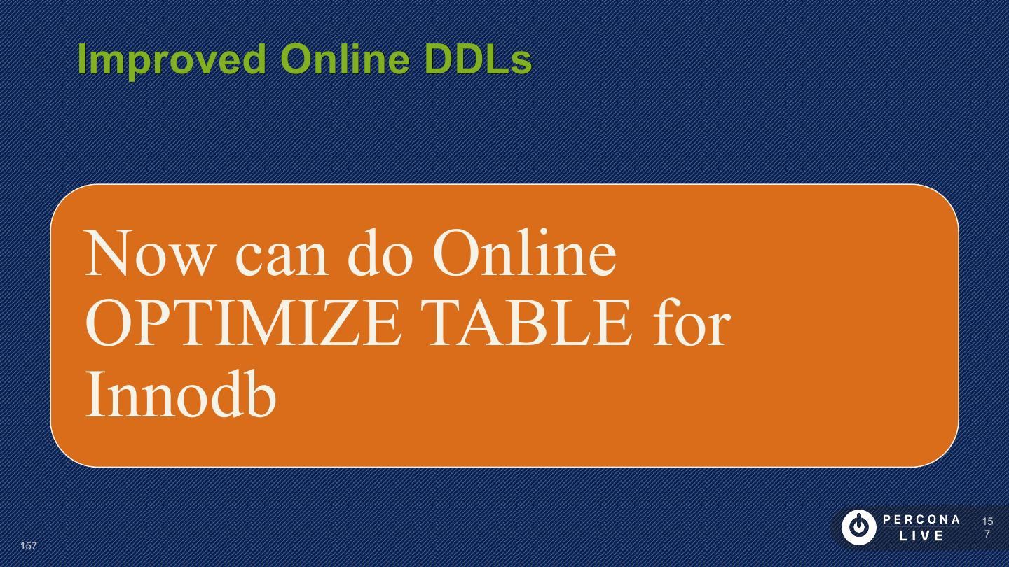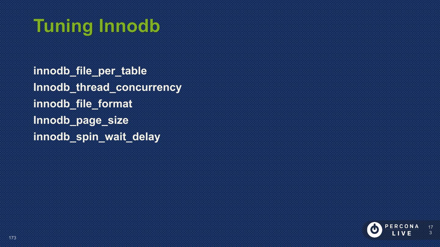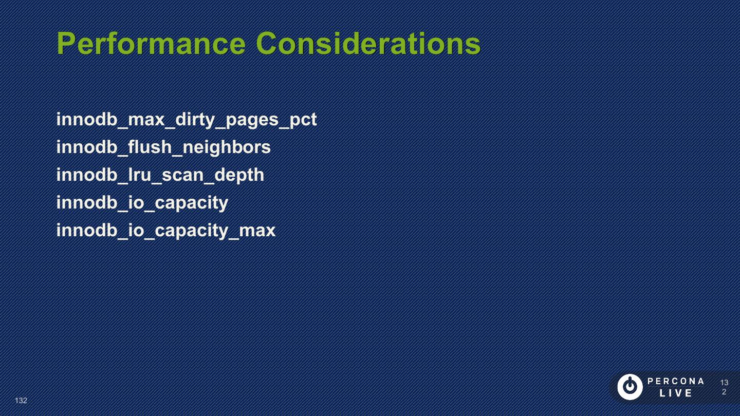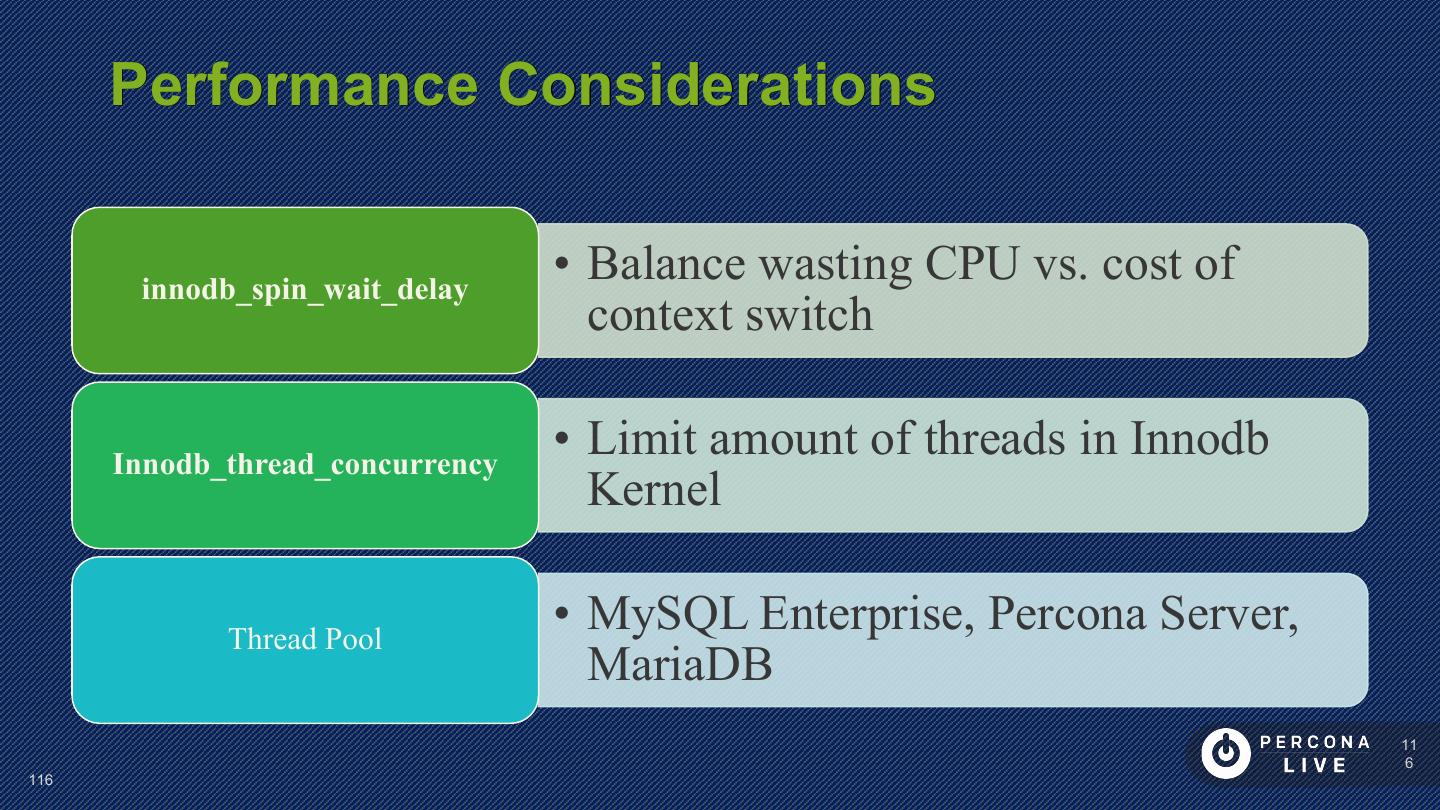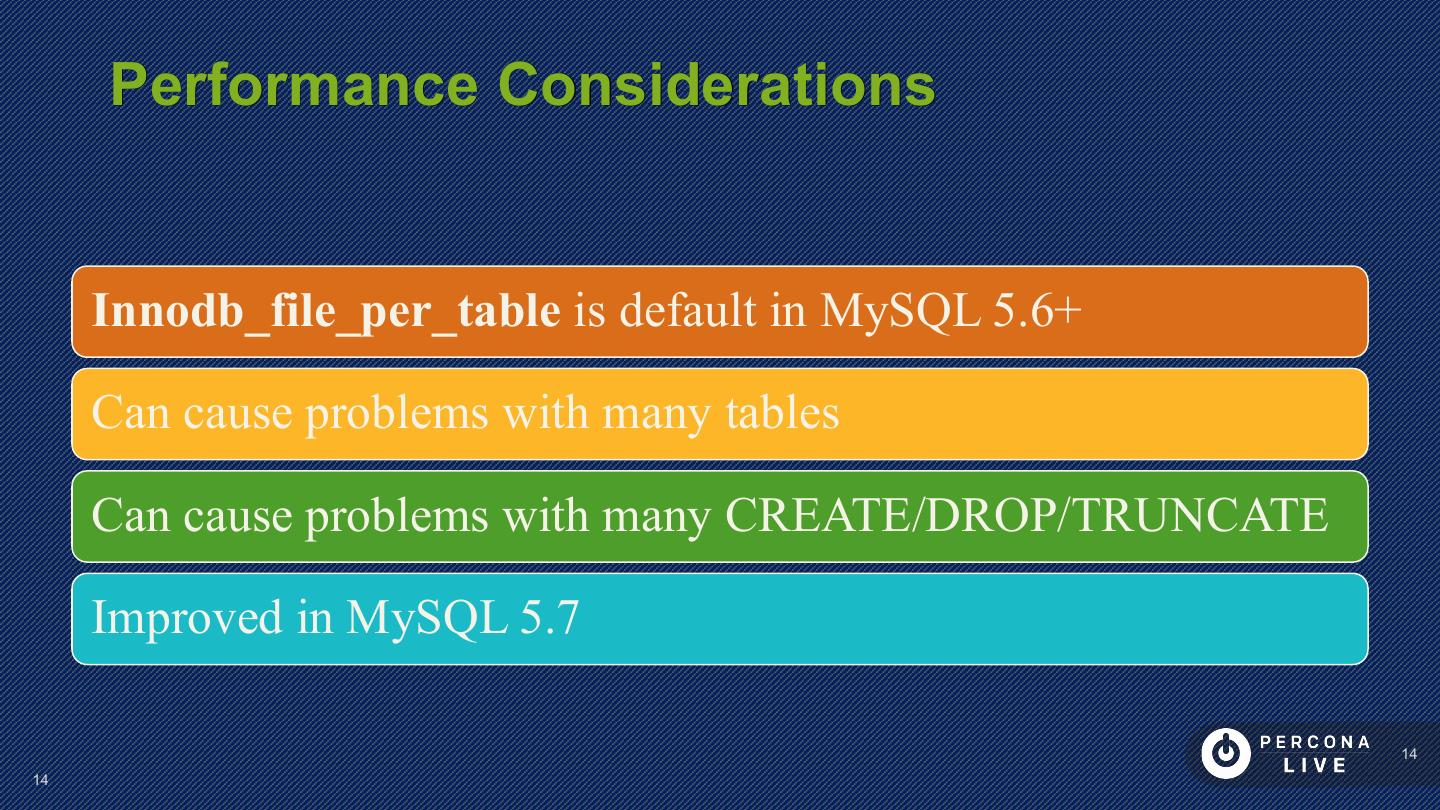 14 . Performance Considerations Innodb_file_per_table is default in MySQL 5.6+ Can cause problems with many tables Can cause problems with many CREATE/DROP/TRUNCATE Improved in MySQL 5.7 14 14
