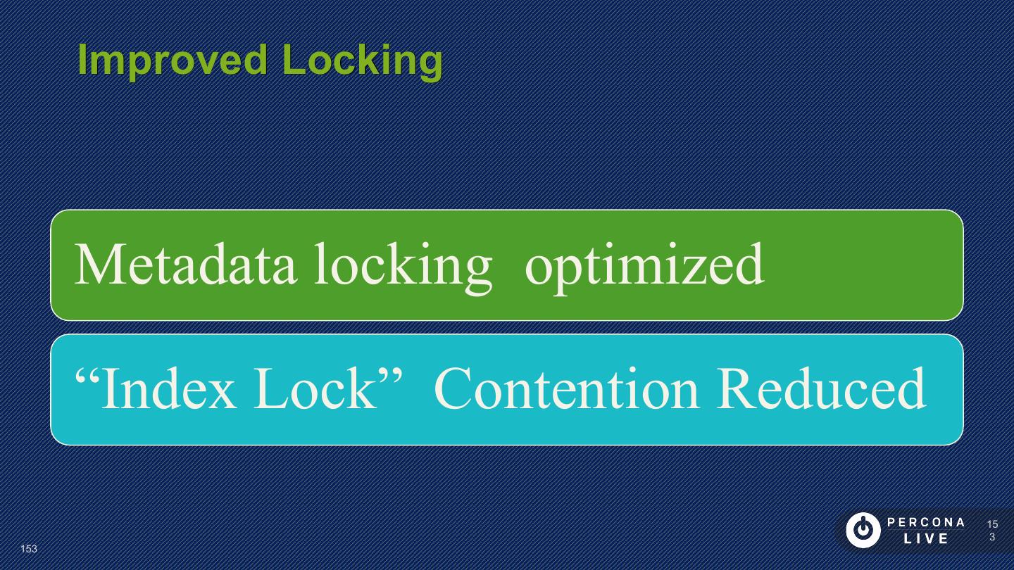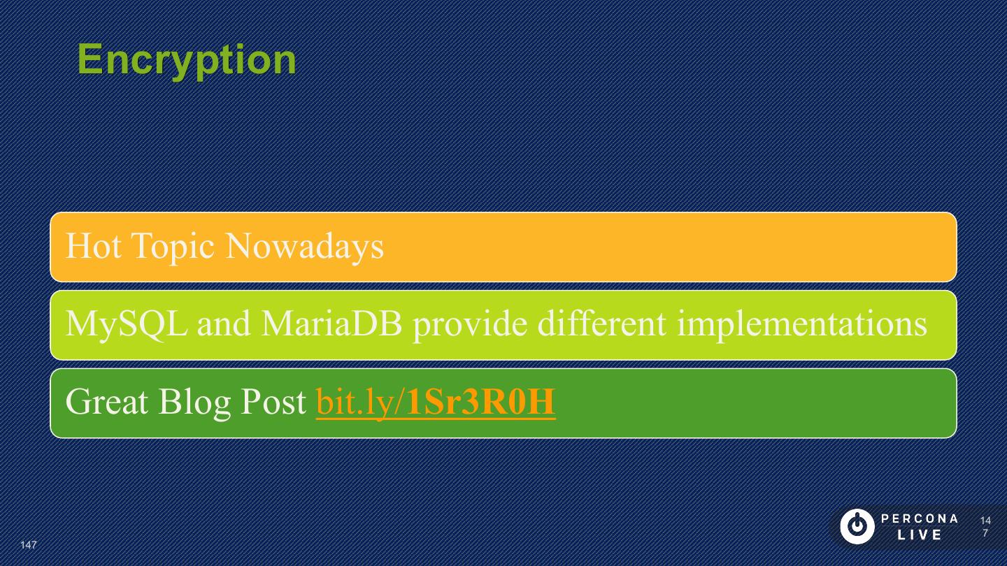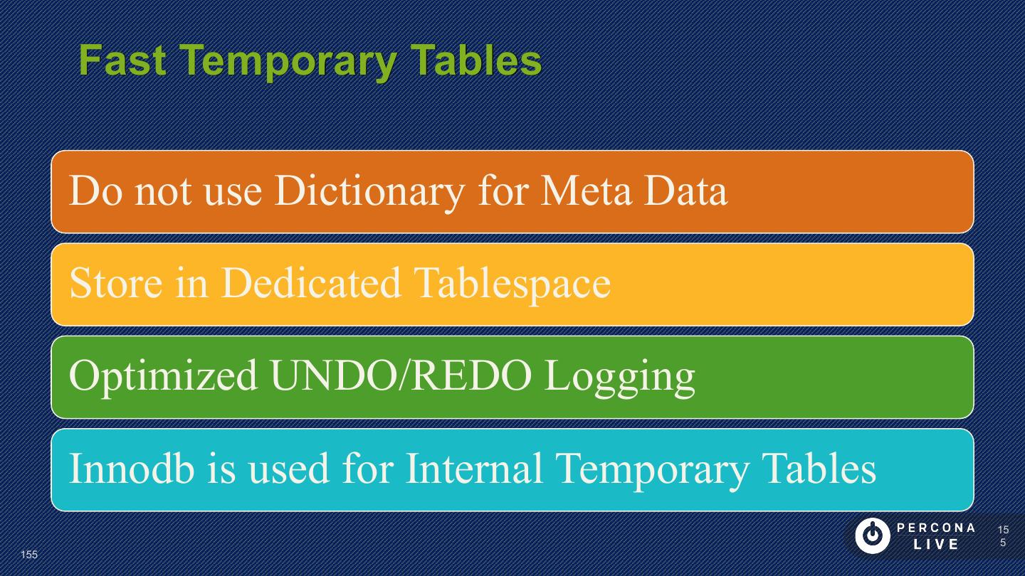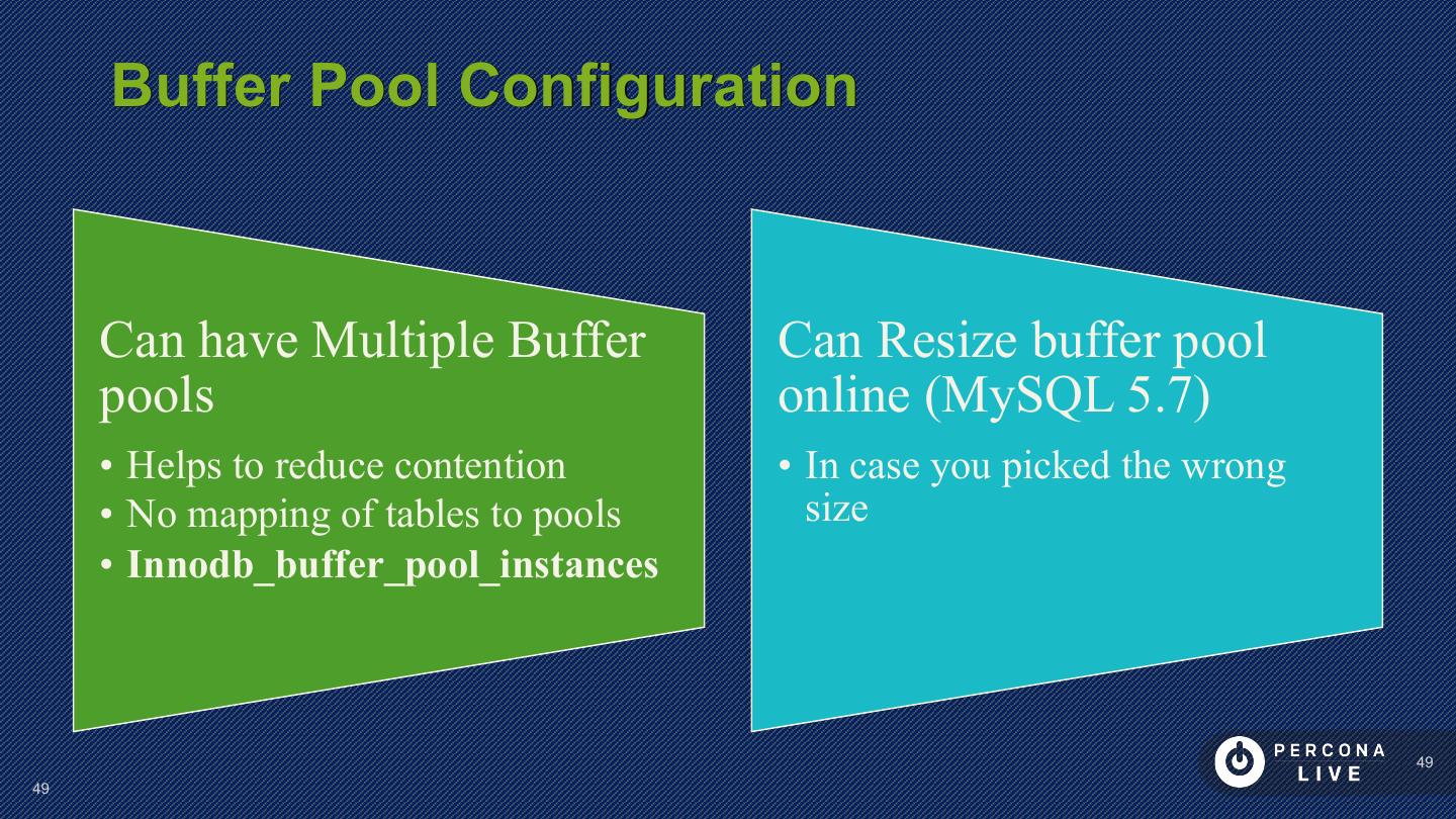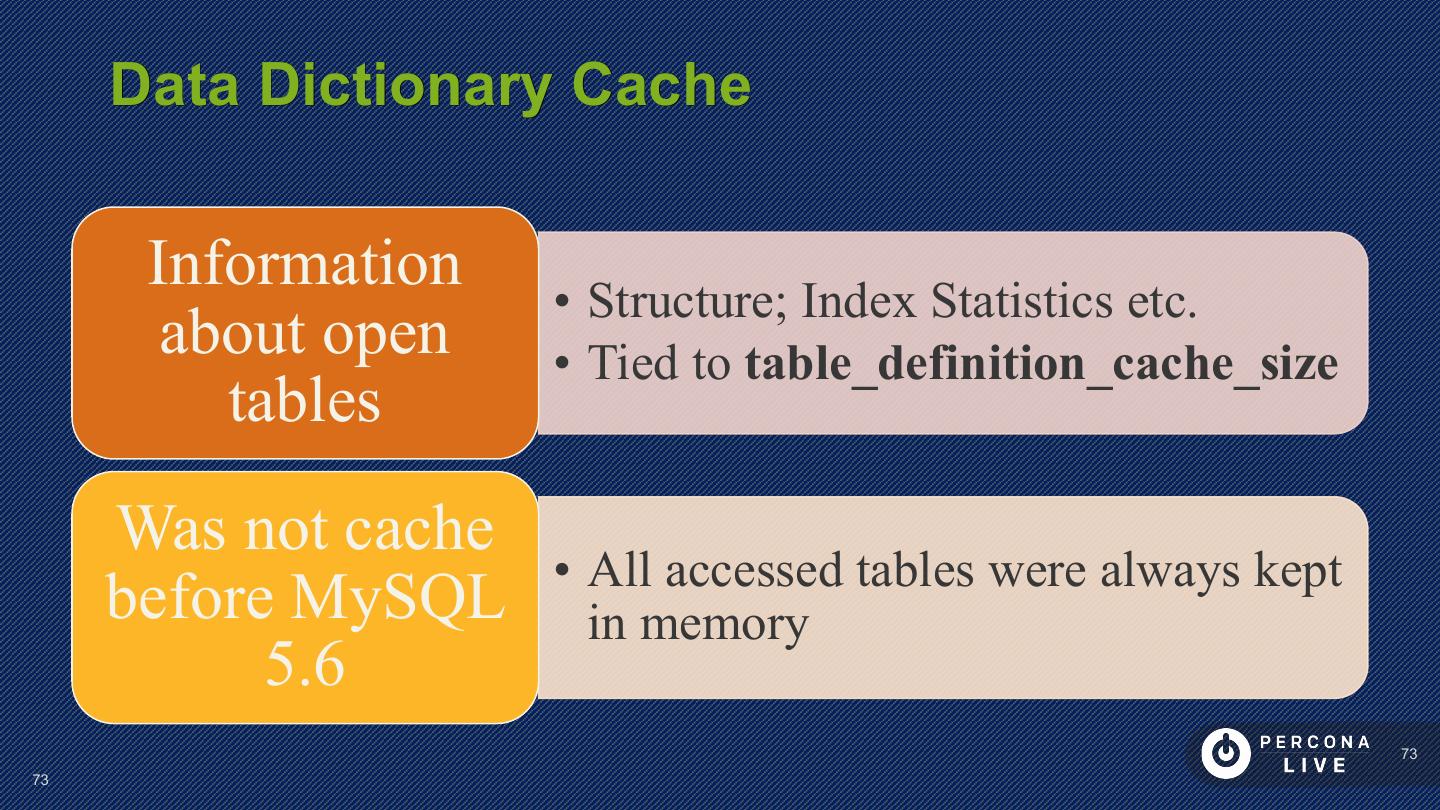 14 . Performance Considerations Innodb_file_per_table is default in MySQL 5.6+ Can cause problems with many tables Can cause problems with many CREATE/DROP/TRUNCATE Improved in MySQL 5.7 14 14
