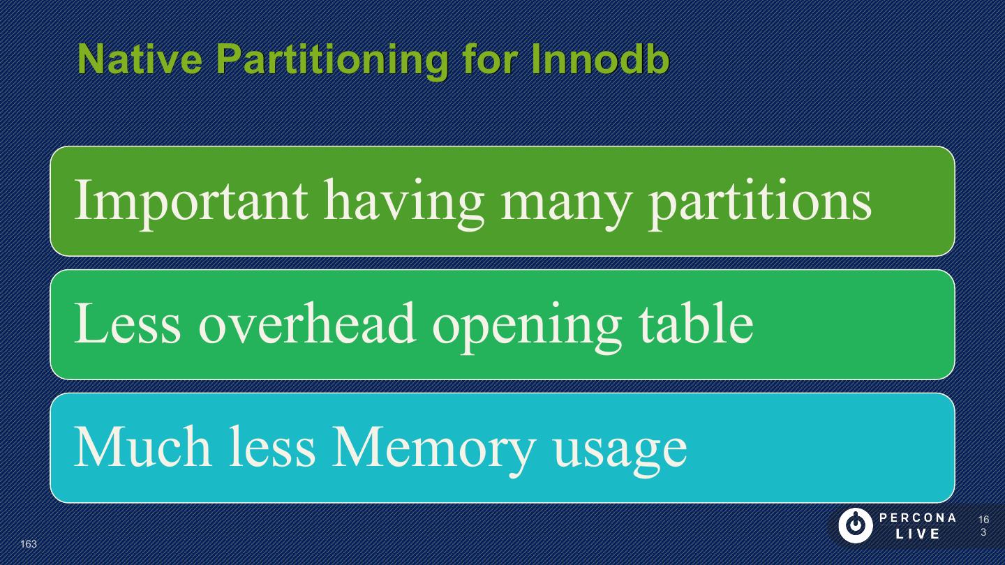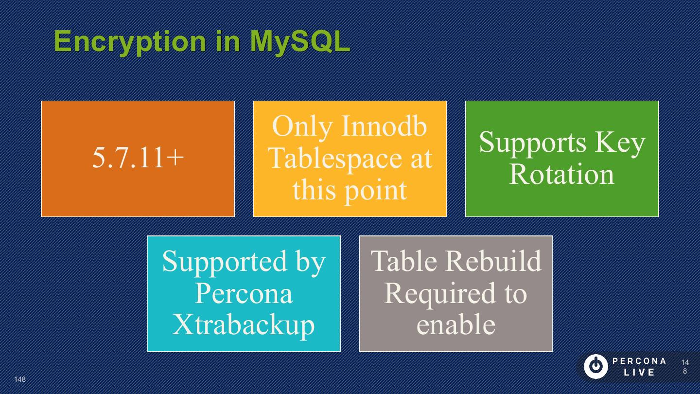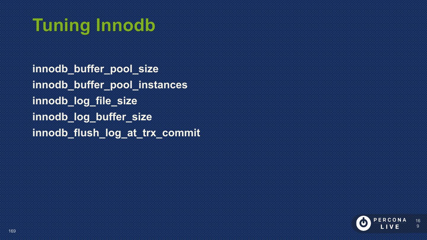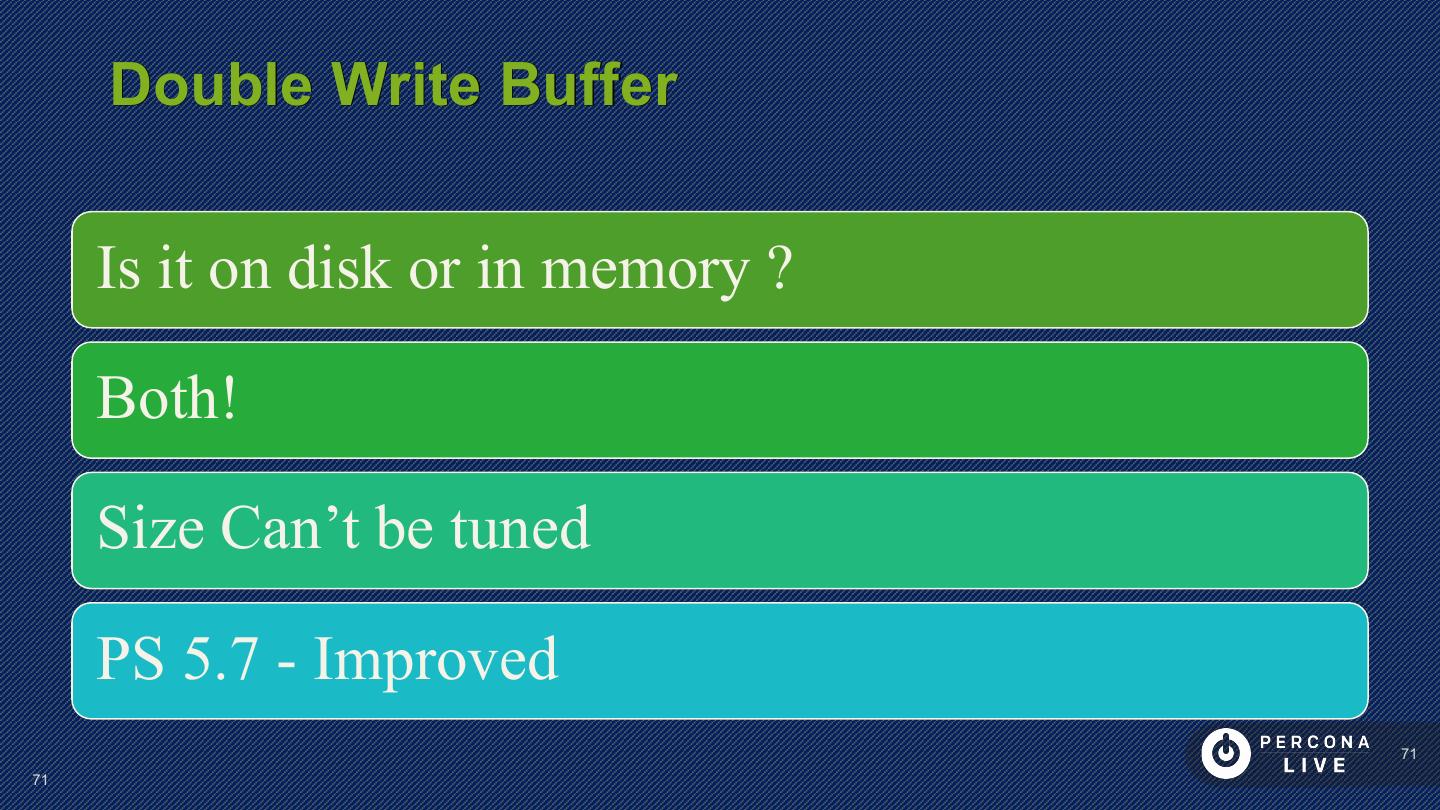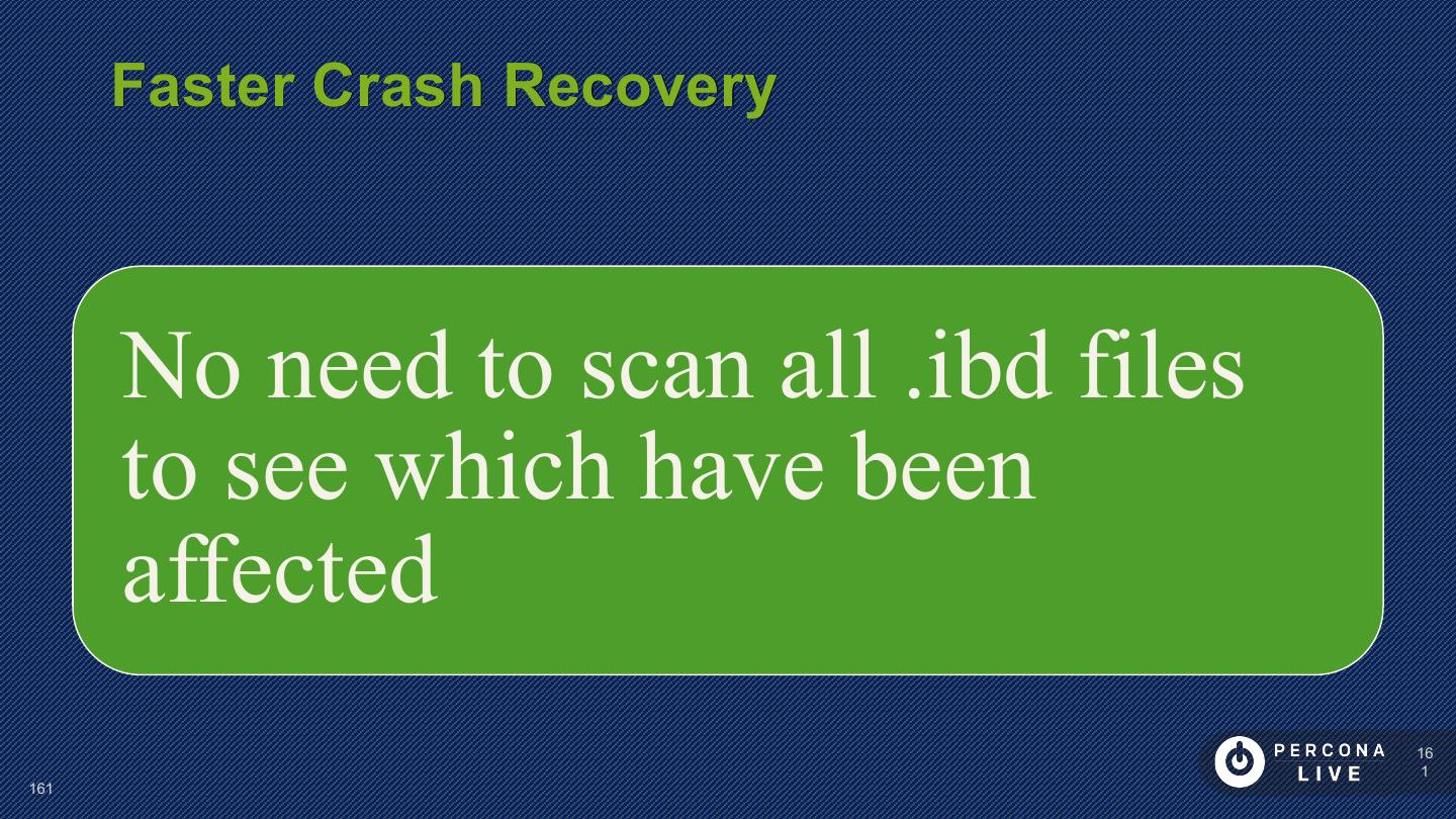 14 . Performance Considerations Innodb_file_per_table is default in MySQL 5.6+ Can cause problems with many tables Can cause problems with many CREATE/DROP/TRUNCATE Improved in MySQL 5.7 14 14