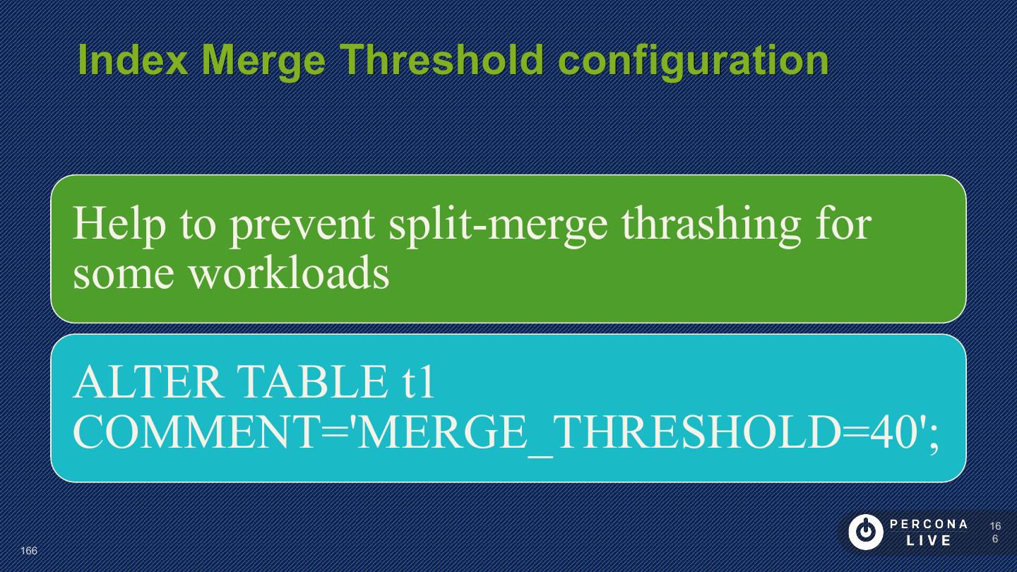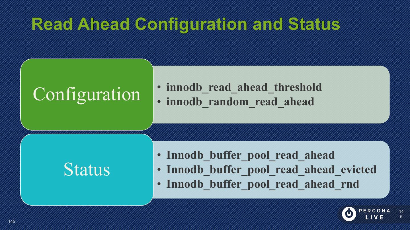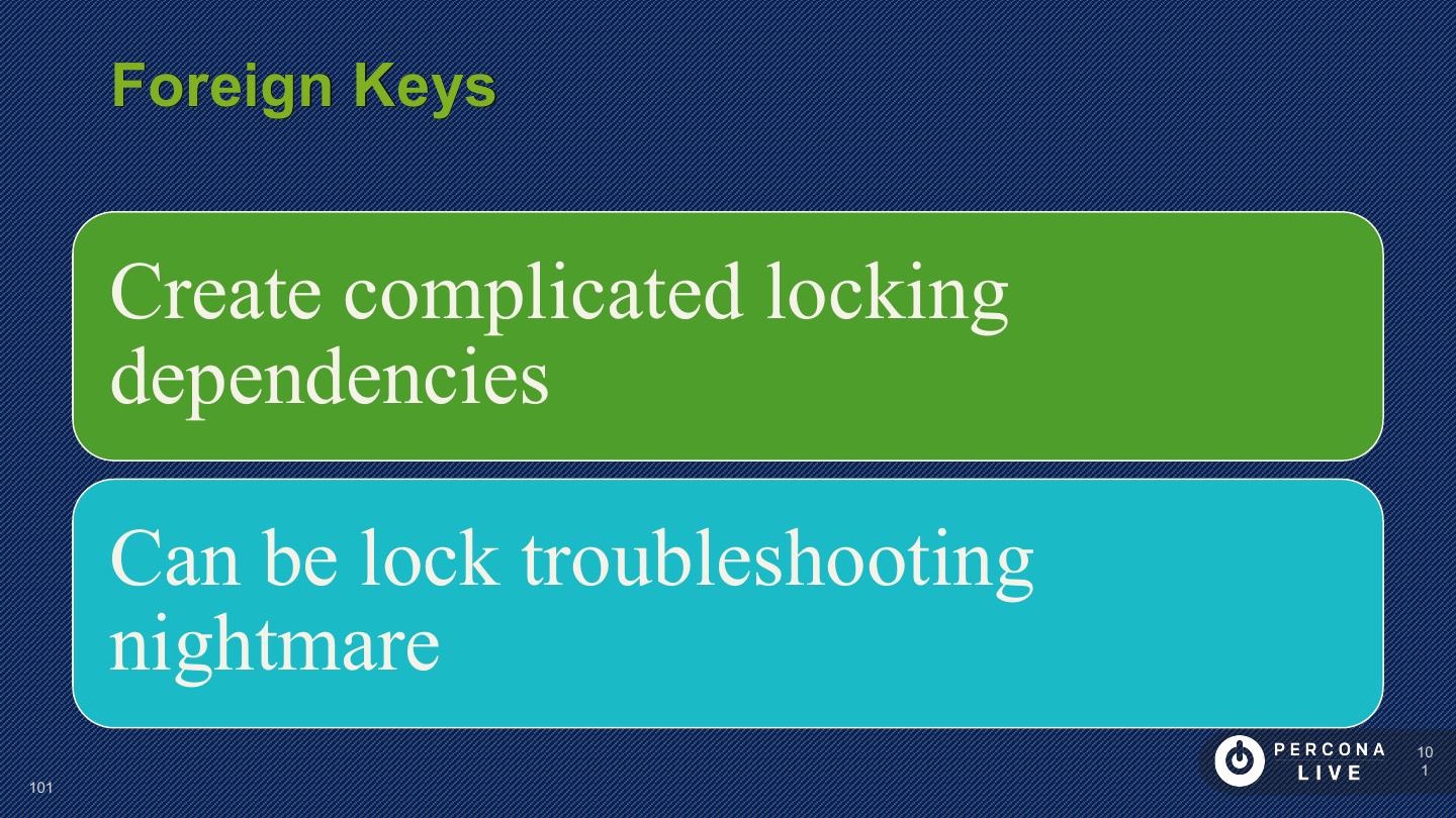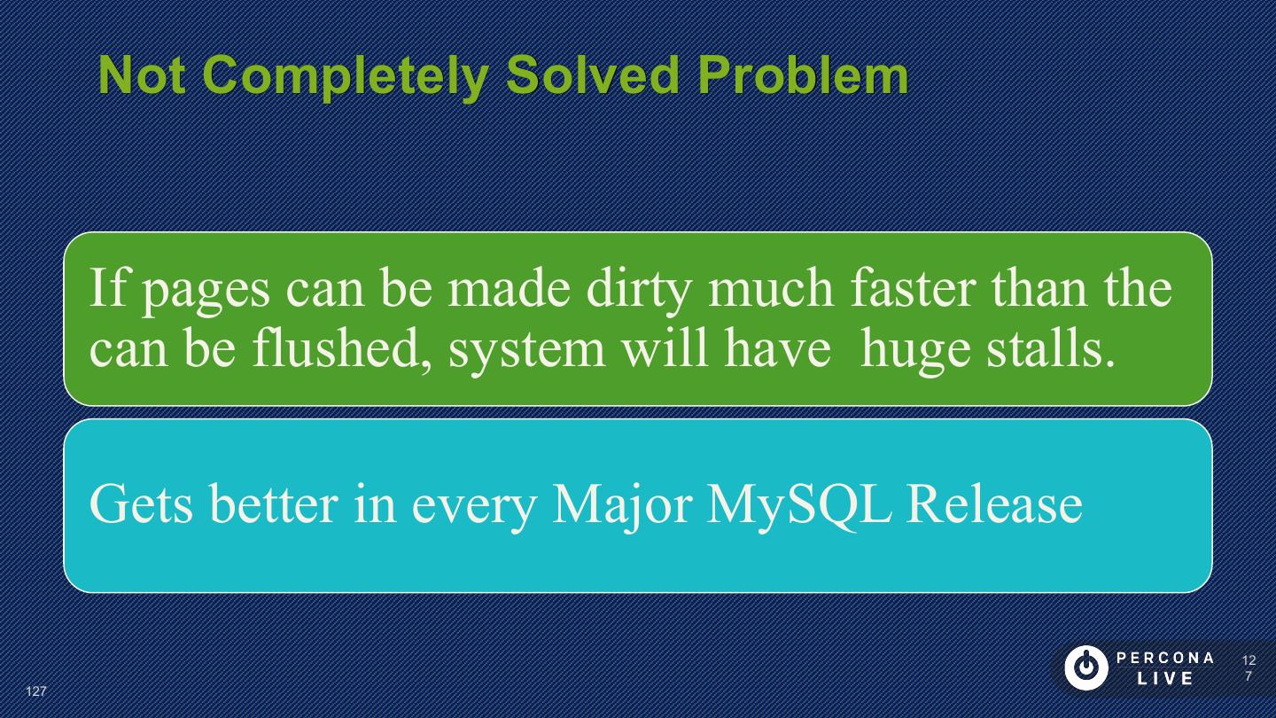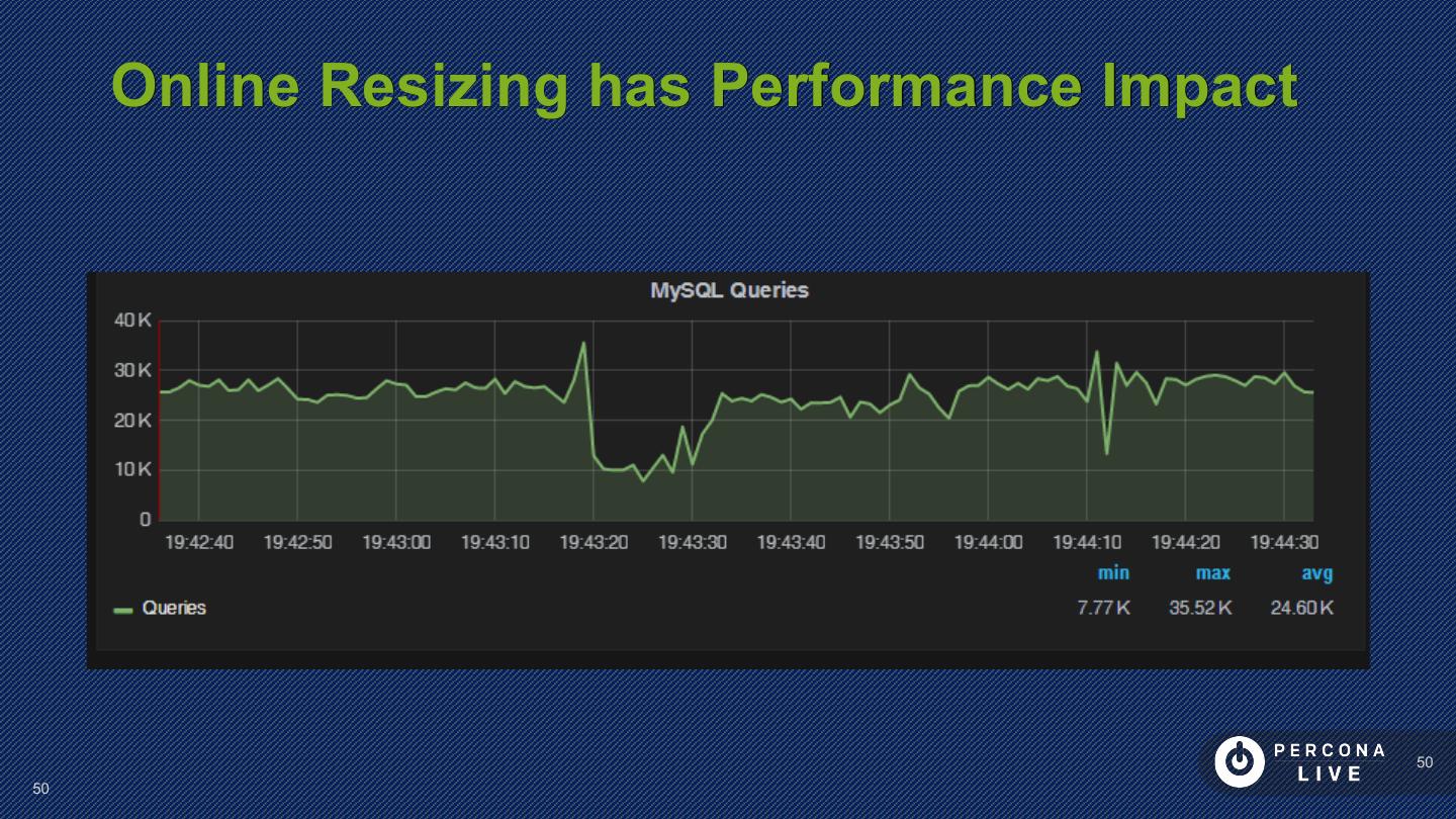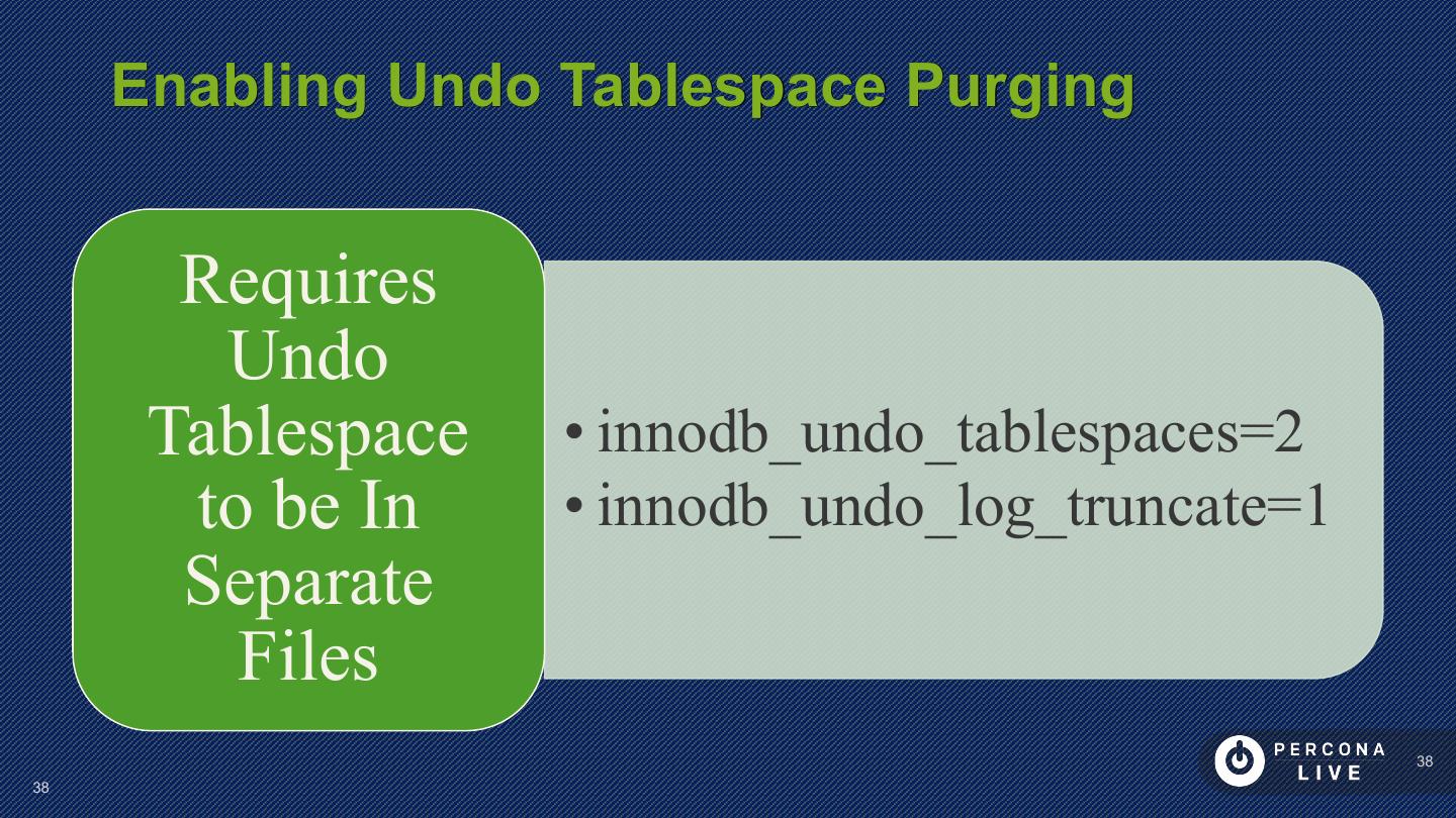 14 . Performance Considerations Innodb_file_per_table is default in MySQL 5.6+ Can cause problems with many tables Can cause problems with many CREATE/DROP/TRUNCATE Improved in MySQL 5.7 14 14
