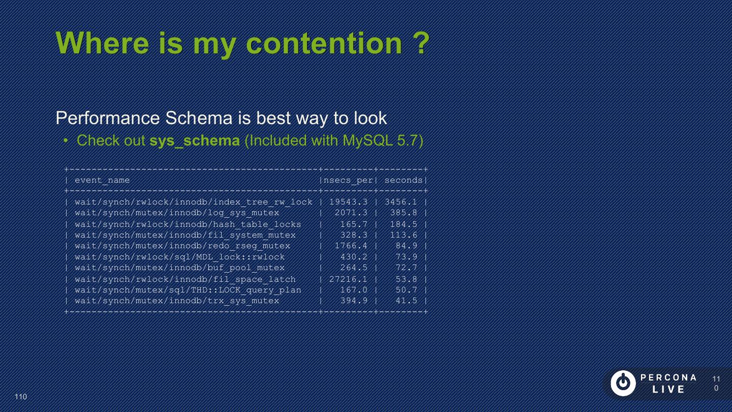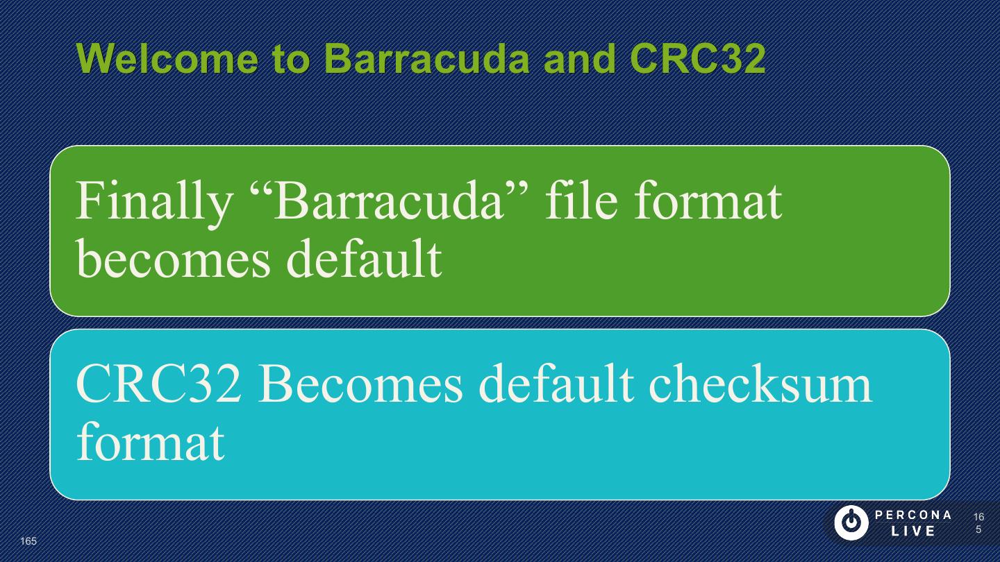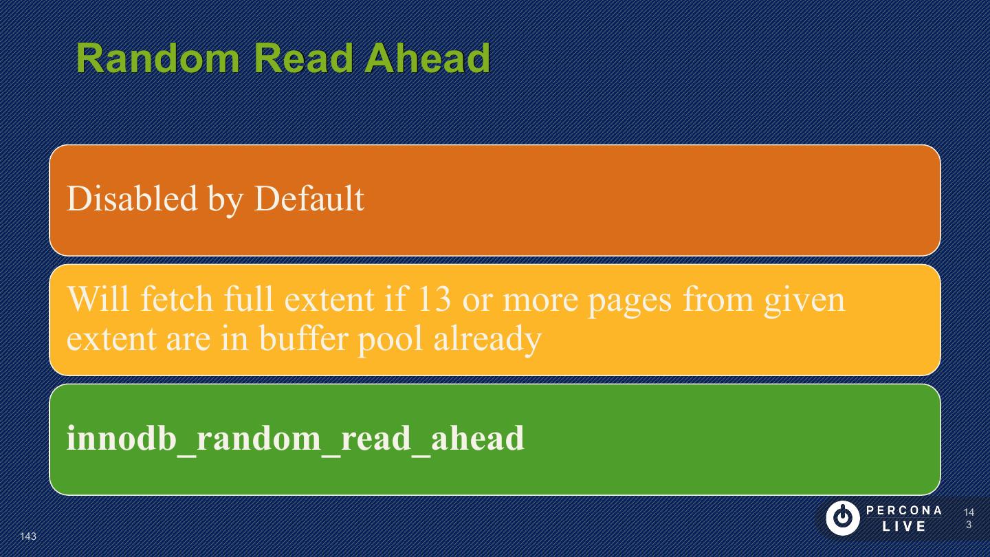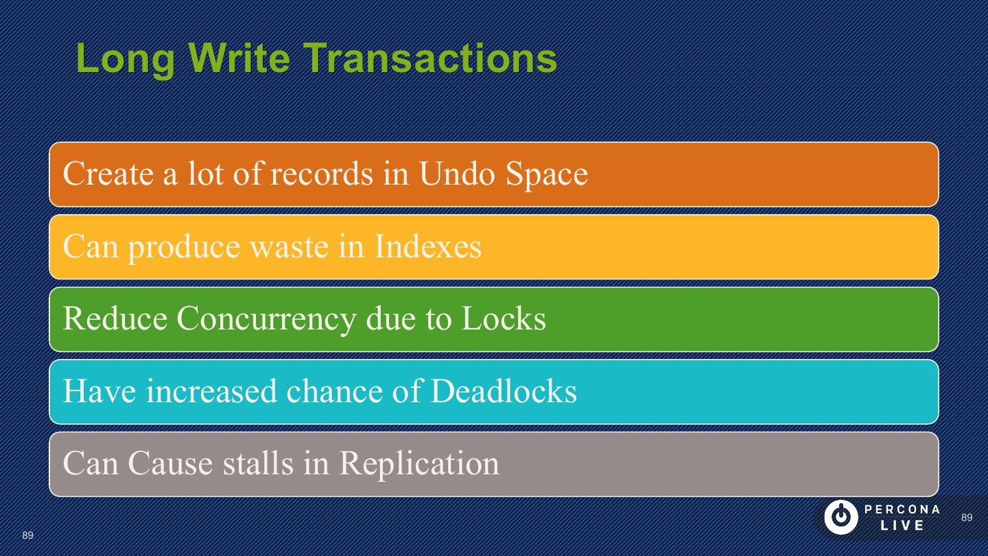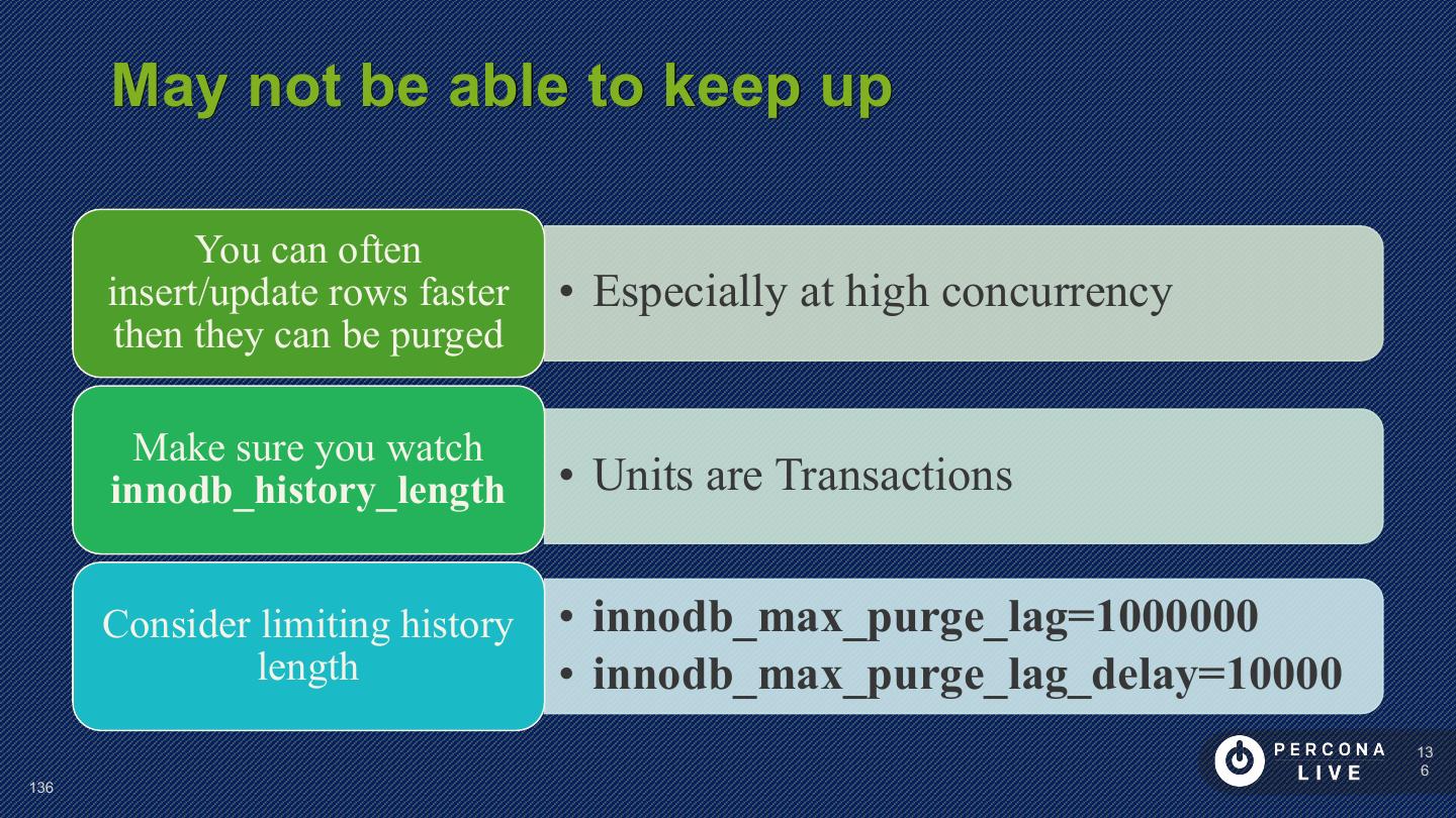 14 . Performance Considerations Innodb_file_per_table is default in MySQL 5.6+ Can cause problems with many tables Can cause problems with many CREATE/DROP/TRUNCATE Improved in MySQL 5.7 14 14