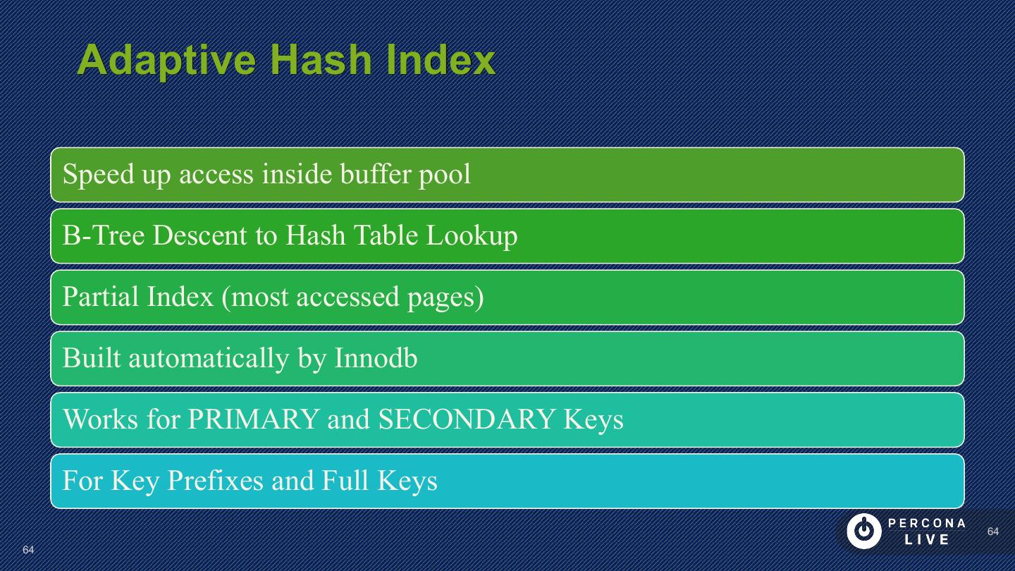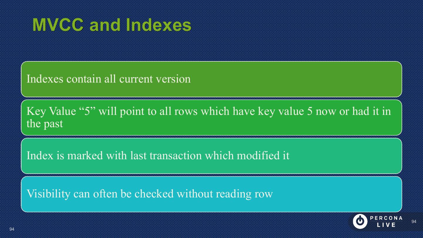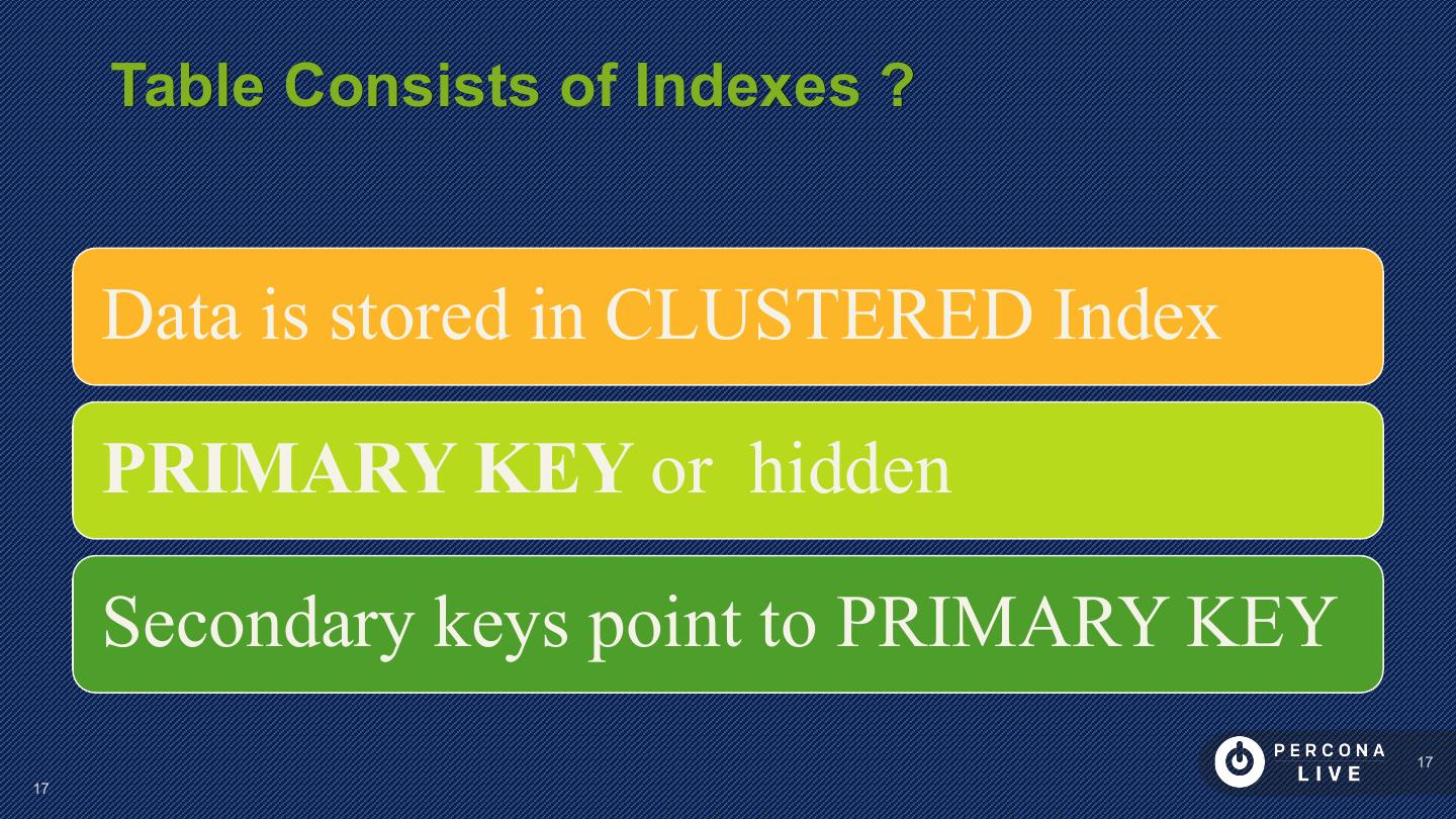 17 . Table Consists of Indexes ? Data is stored in CLUSTERED Index PRIMARY KEY or hidden Secondary keys point to PRIMARY KEY 17 17