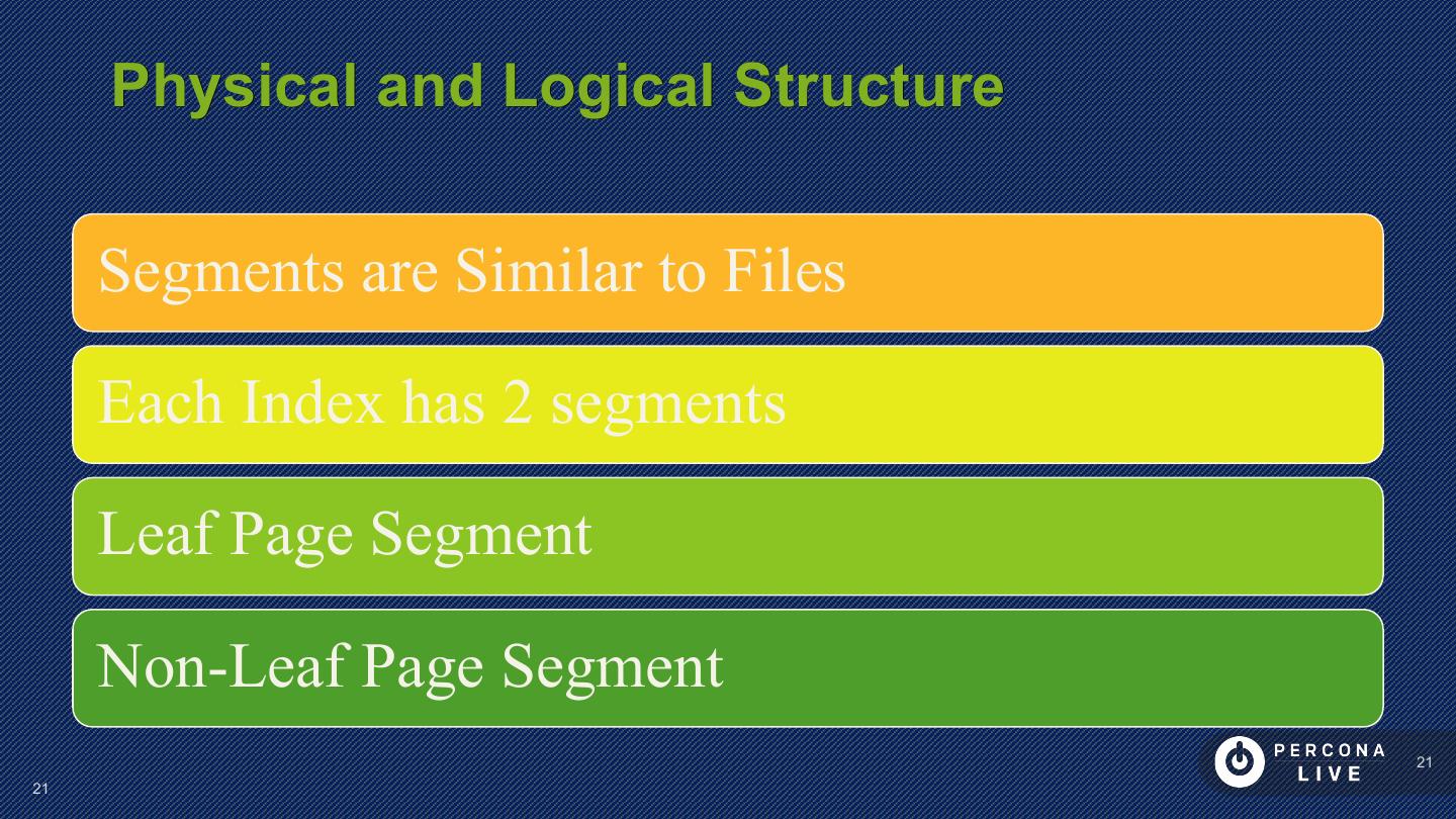 21 . Physical and Logical Structure Segments are Similar to Files Each Index has 2 segments Leaf Page Segment Non-Leaf Page Segment 21 21