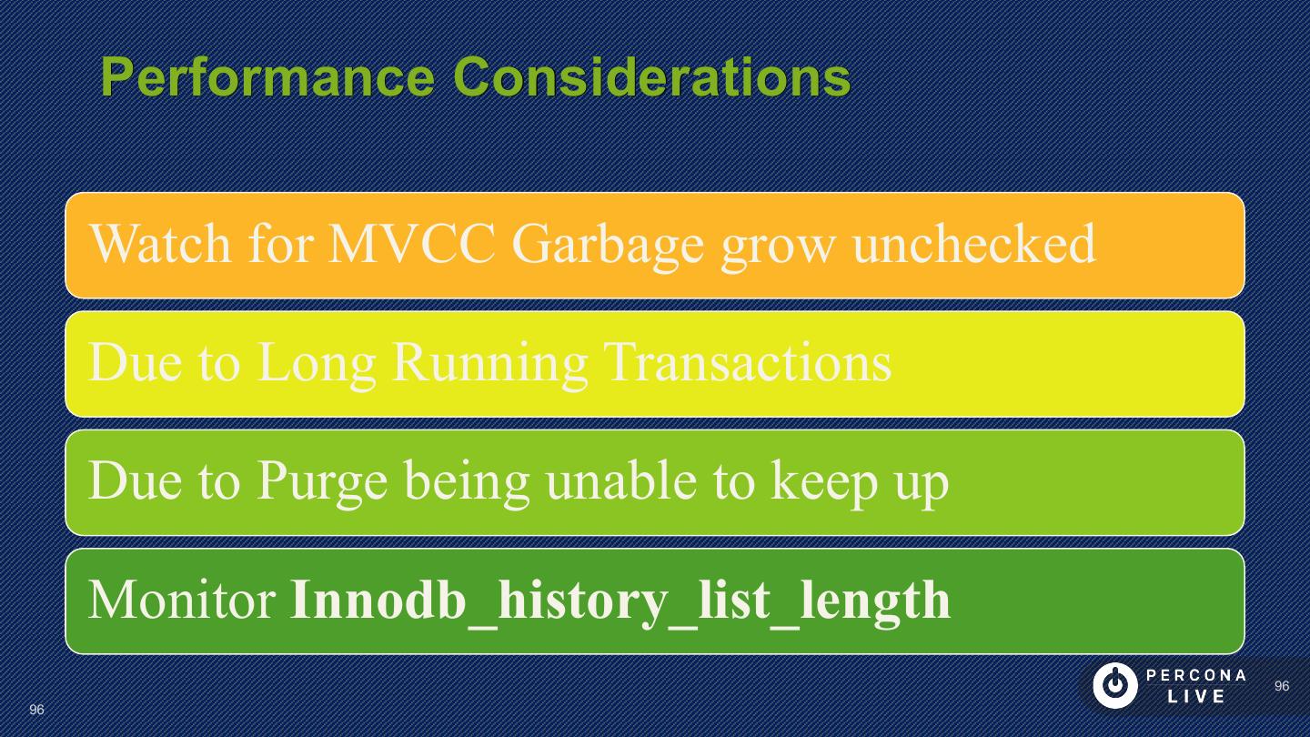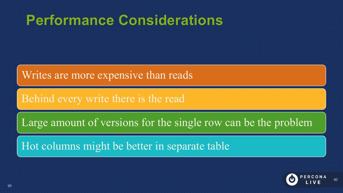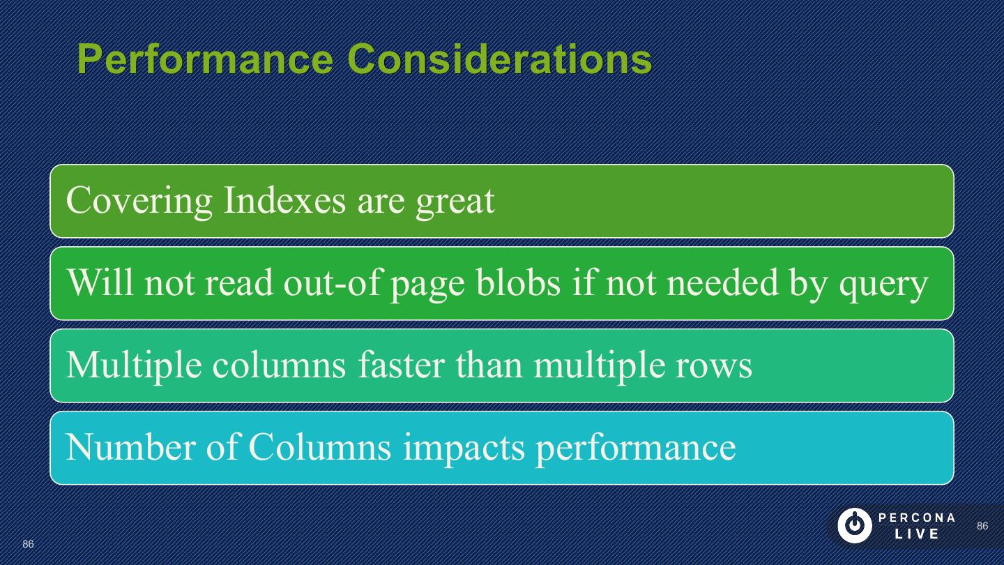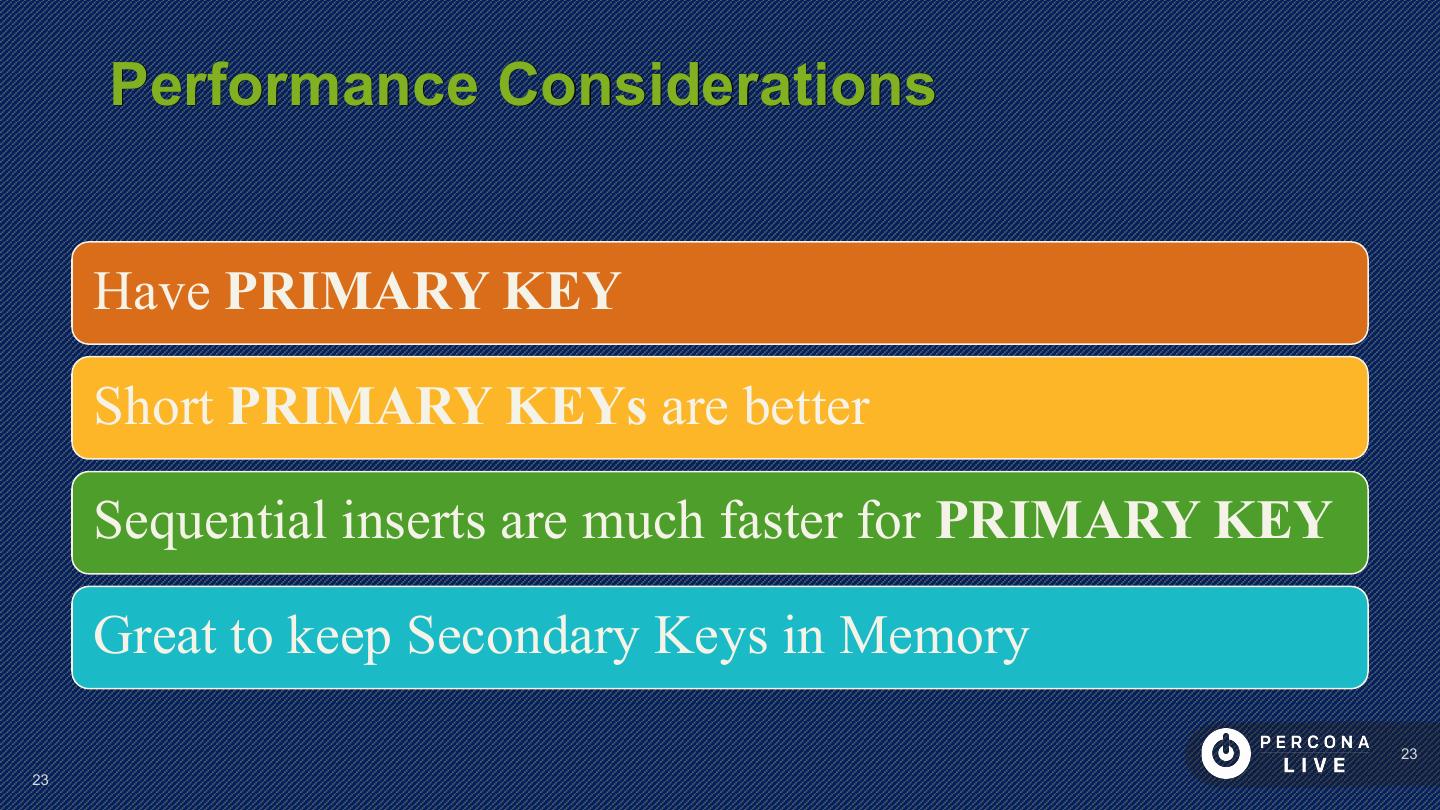 23 . Performance Considerations Have PRIMARY KEY Short PRIMARY KEYs are better Sequential inserts are much faster for PRIMARY KEY Great to keep Secondary Keys in Memory 23 23