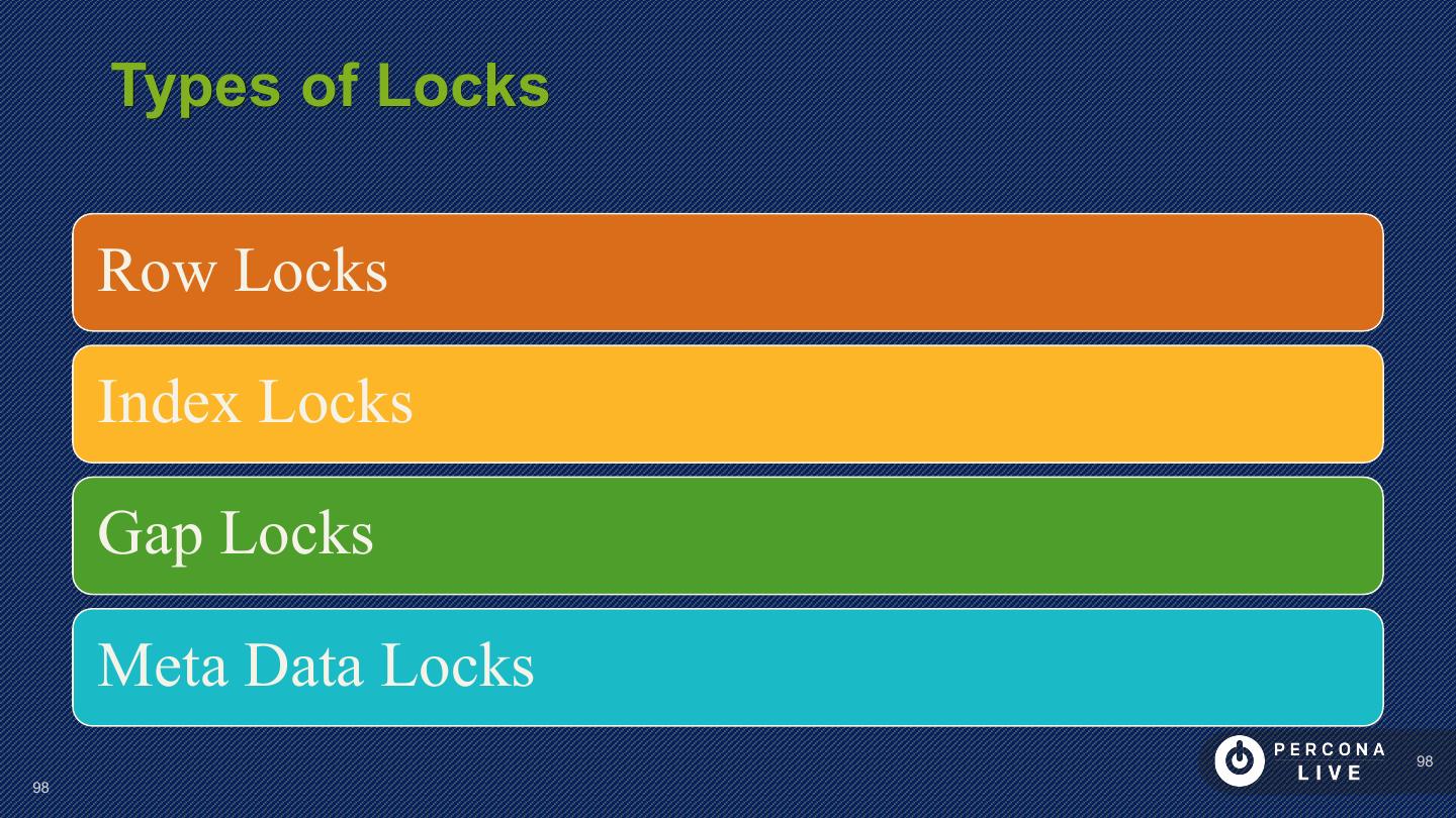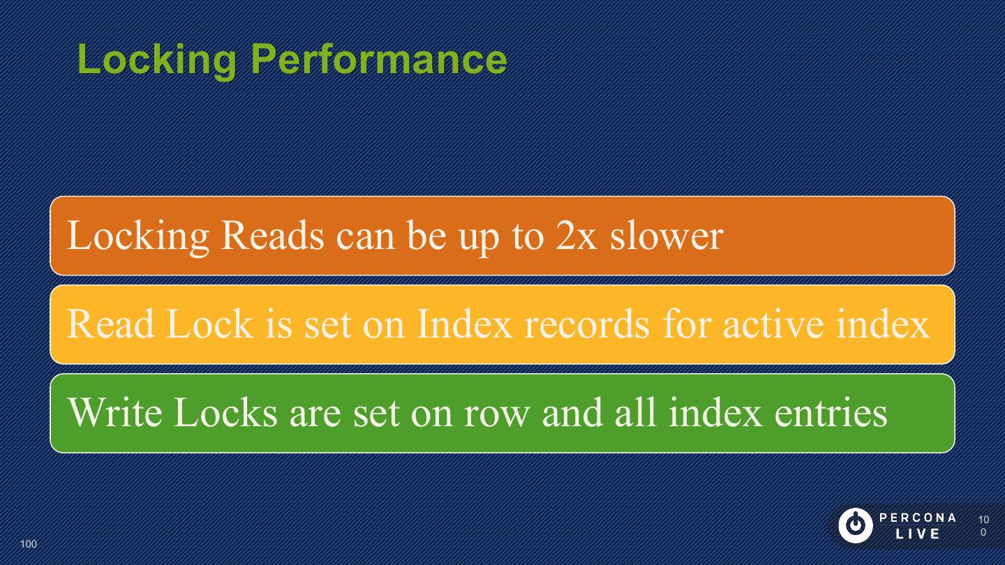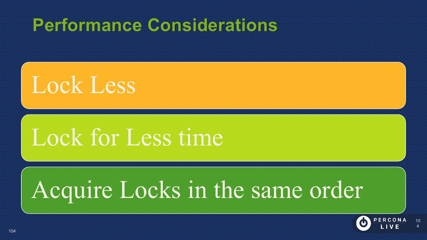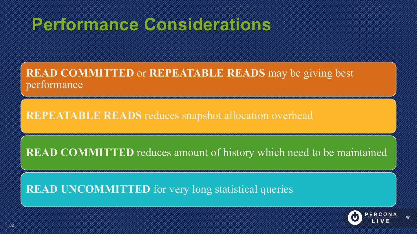23 . Performance Considerations Have PRIMARY KEY Short PRIMARY KEYs are better Sequential inserts are much faster for PRIMARY KEY Great to keep Secondary Keys in Memory 23 23