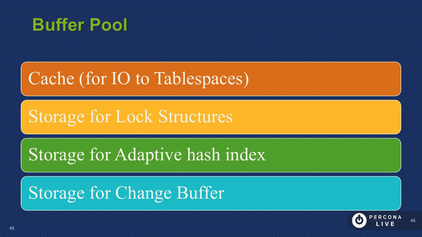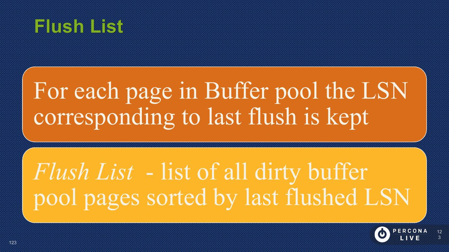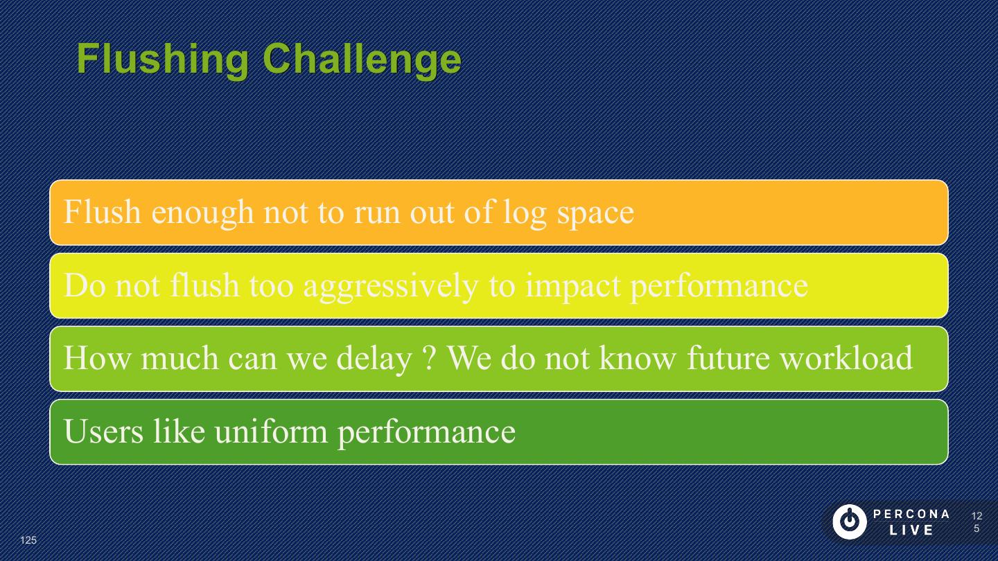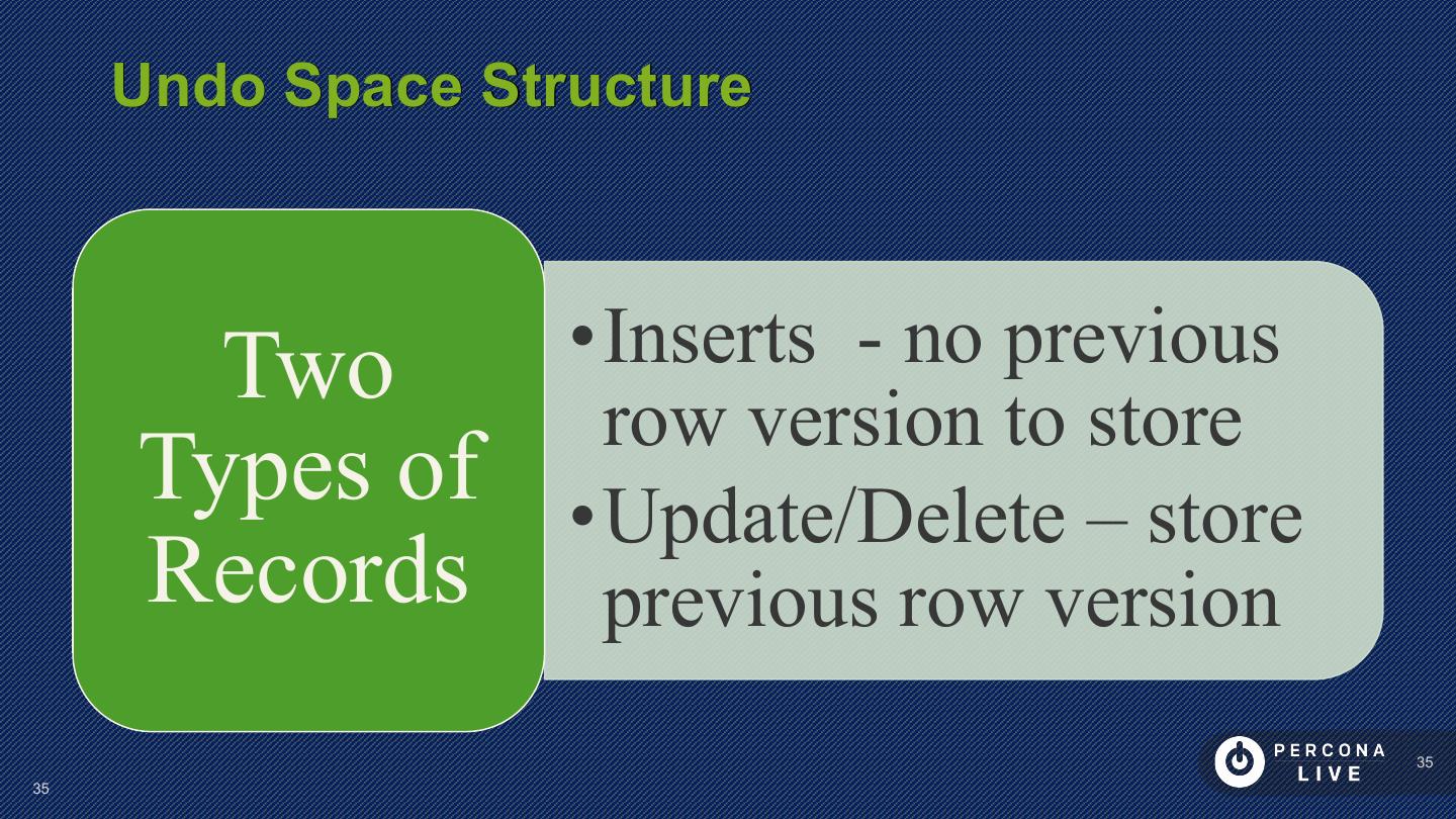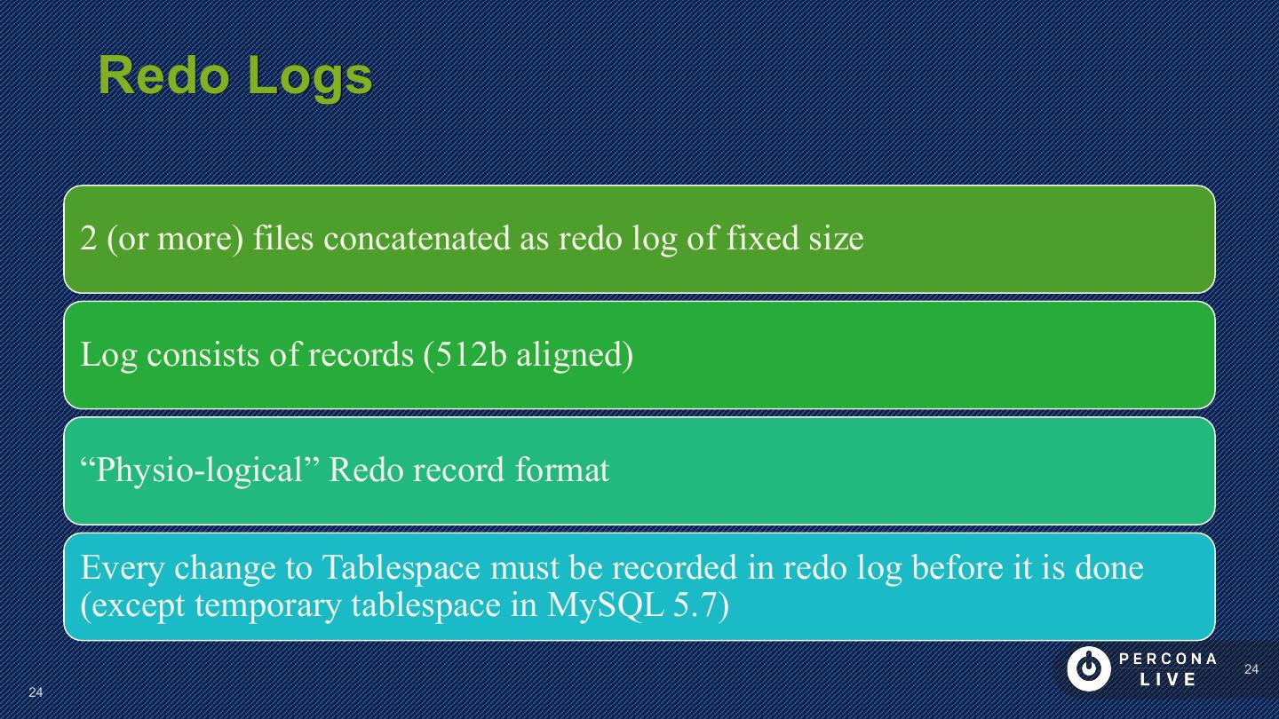 24 . Redo Logs 2 (or more) files concatenated as redo log of fixed size Log consists of records (512b aligned) “Physio-logical” Redo record format Every change to Tablespace must be recorded in redo log before it is done (except temporary tablespace in MySQL 5.7) 24 24