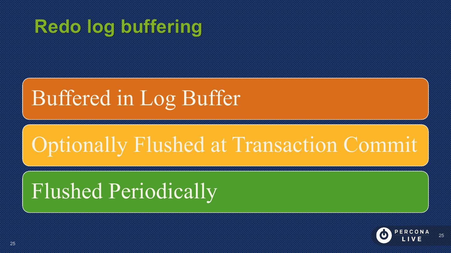 25 . Redo log buffering Buffered in Log Buffer Optionally Flushed at Transaction Commit Flushed Periodically 25 25