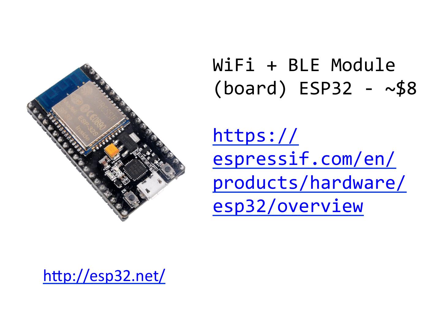 7 . WiFi + BLE Module (board) ESP32 - ~$8 https:// espressif.com/en/ products/hardware/ esp32/overview hMp://esp32.net/