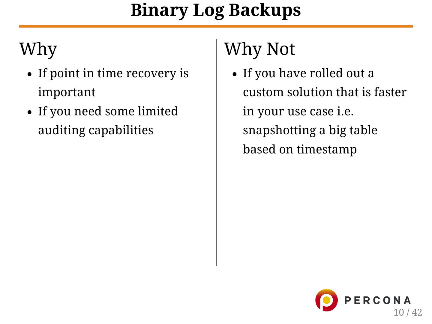 9 . Binary Log Backups Pros and Cons? There is nothing to discuss really, just Yes or No Hopefully, you choose Yes Binary log backups is uniquely important on its own. 9 / 42