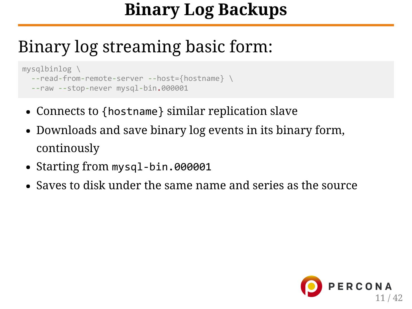 8 . Binary Log Backups Its not just another type of backup ... mysqlbinlog as primary tool of choice, but you can write your own! Support from mysqlbinlog only became available from 5.6, but can be used <5.6 servers Complements other backup types for Point in Time Recovery 8 / 42