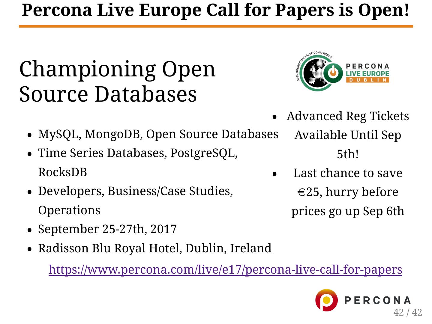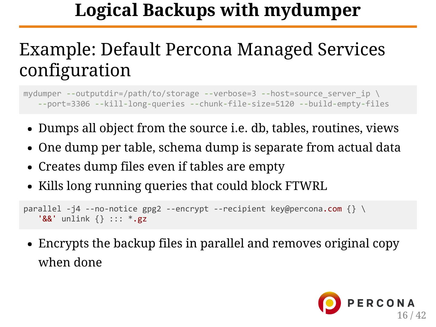 16 . Logical Backups with mydumper Example: Default Percona Managed Services configuration mydumper ‐‐outputdir=/path/to/storage ‐‐verbose=3 ‐‐host=source_server_ip \ ‐‐port=3306 ‐‐kill‐long‐queries ‐‐chunk‐file‐size=5120 ‐‐build‐empty‐files Dumps all object from the source i.e. db, tables, routines, views One dump per table, schema dump is separate from actual data Creates dump files even if tables are empty Kills long running queries that could block FTWRL parallel ‐j4 ‐‐no‐notice gpg2 ‐‐encrypt ‐‐recipient key@percona.com {} \ '&&' unlink {} ::: *.gz Encrypts the backup files in parallel and removes original copy when done 16 / 42
