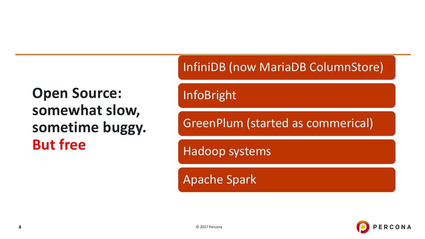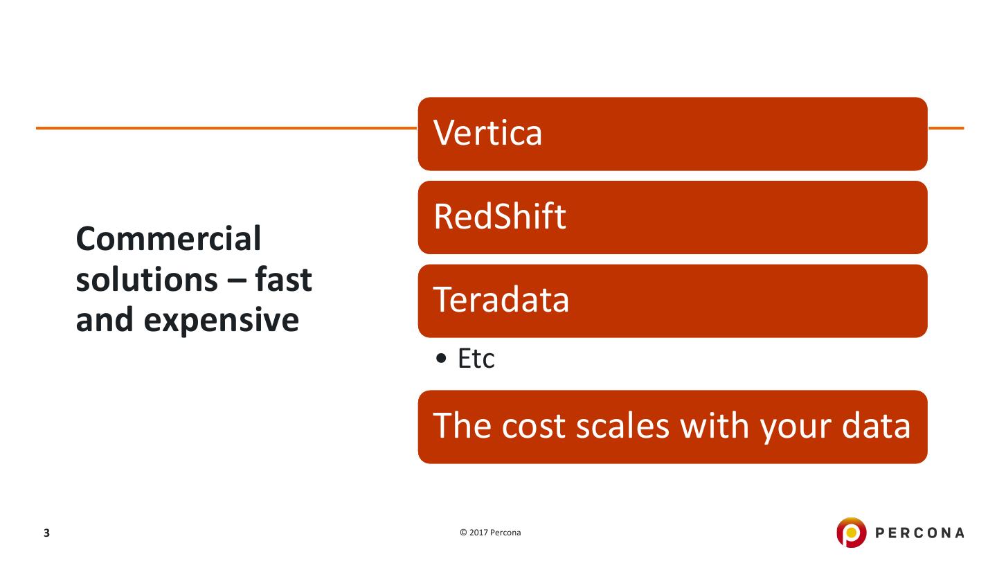 3 . Vertica RedShift Commercial solutions – fast and expensive Teradata • Etc The cost scales with your data 3 © 2017 Percona