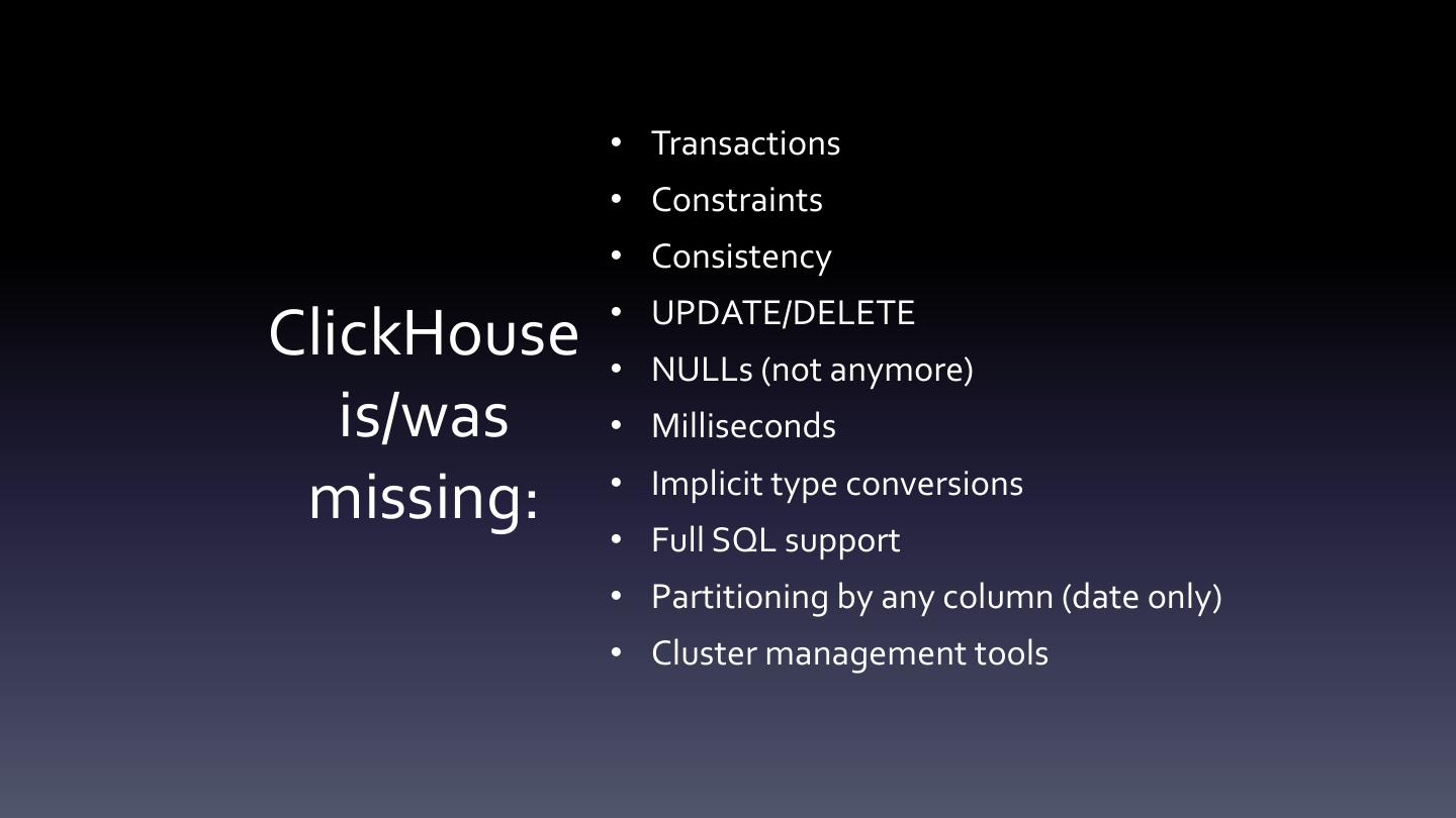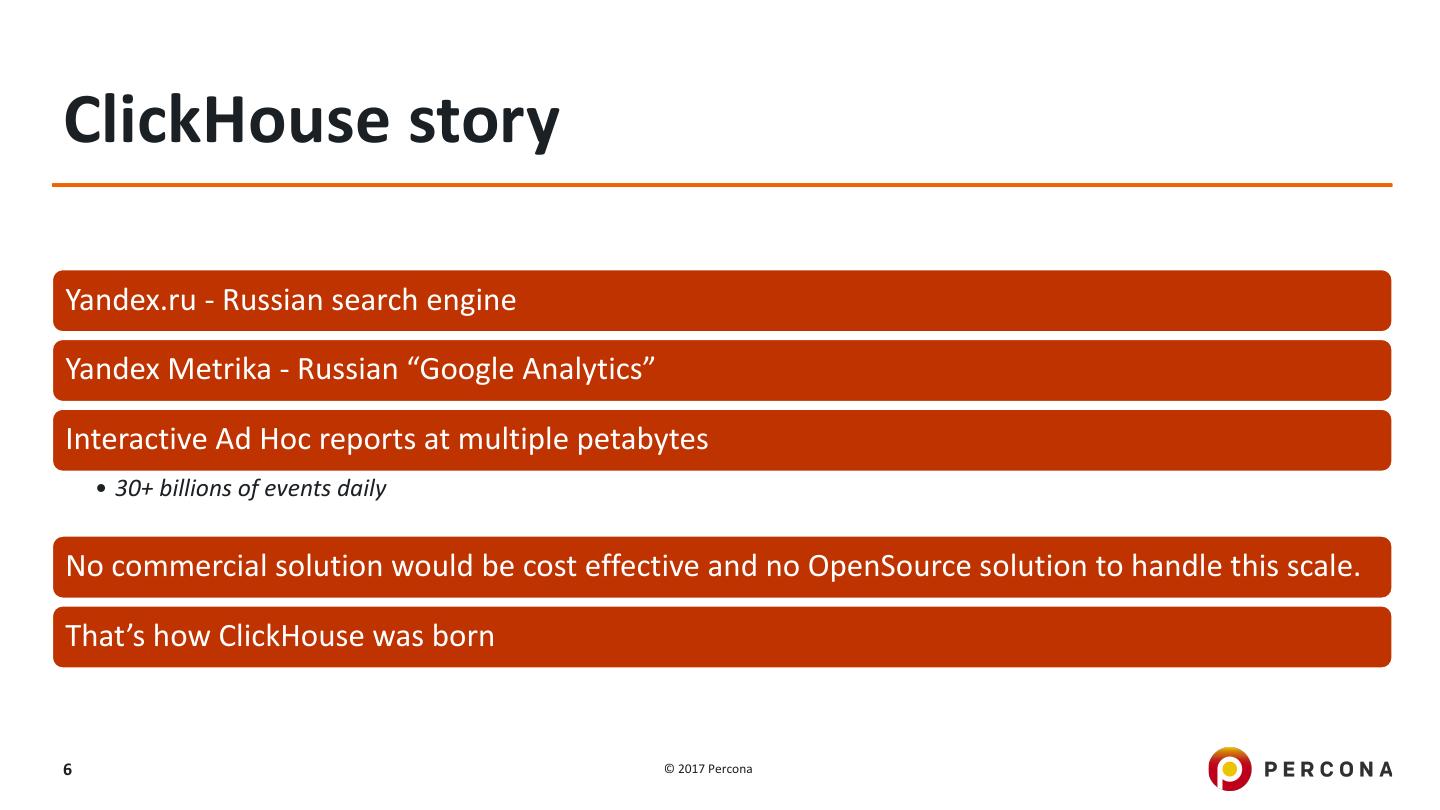 6 .ClickHouse story Yandex.ru - Russian search engine Yandex Metrika - Russian “Google Analytics” Interactive Ad Hoc reports at multiple petabytes • 30+ billions of events daily No commercial solution would be cost effective and no OpenSource solution to handle this scale. That’s how ClickHouse was born 6 © 2017 Percona