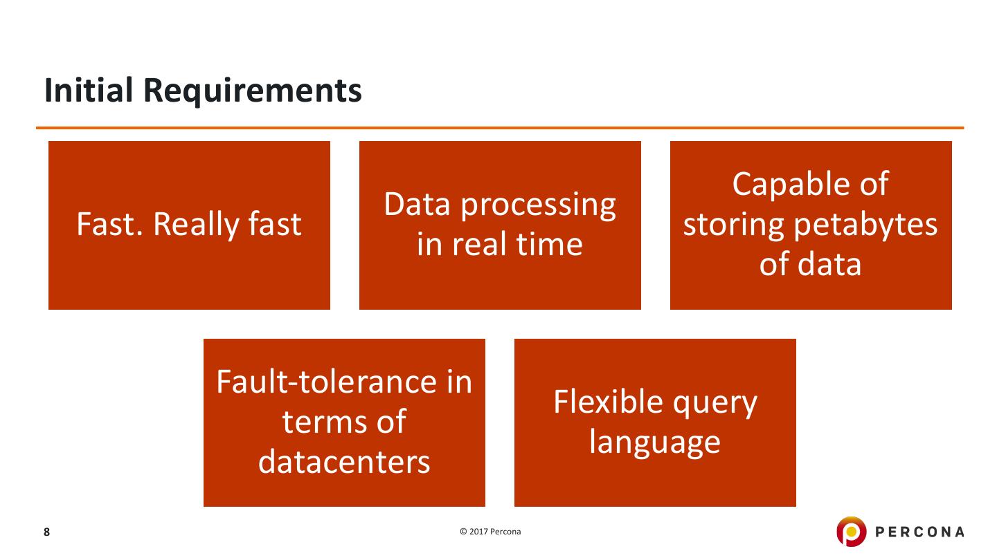 8 .Initial Requirements Capable of Data processing Fast. Really fast storing petabytes in real time of data Fault-tolerance in Flexible query terms of language datacenters 8 © 2017 Percona