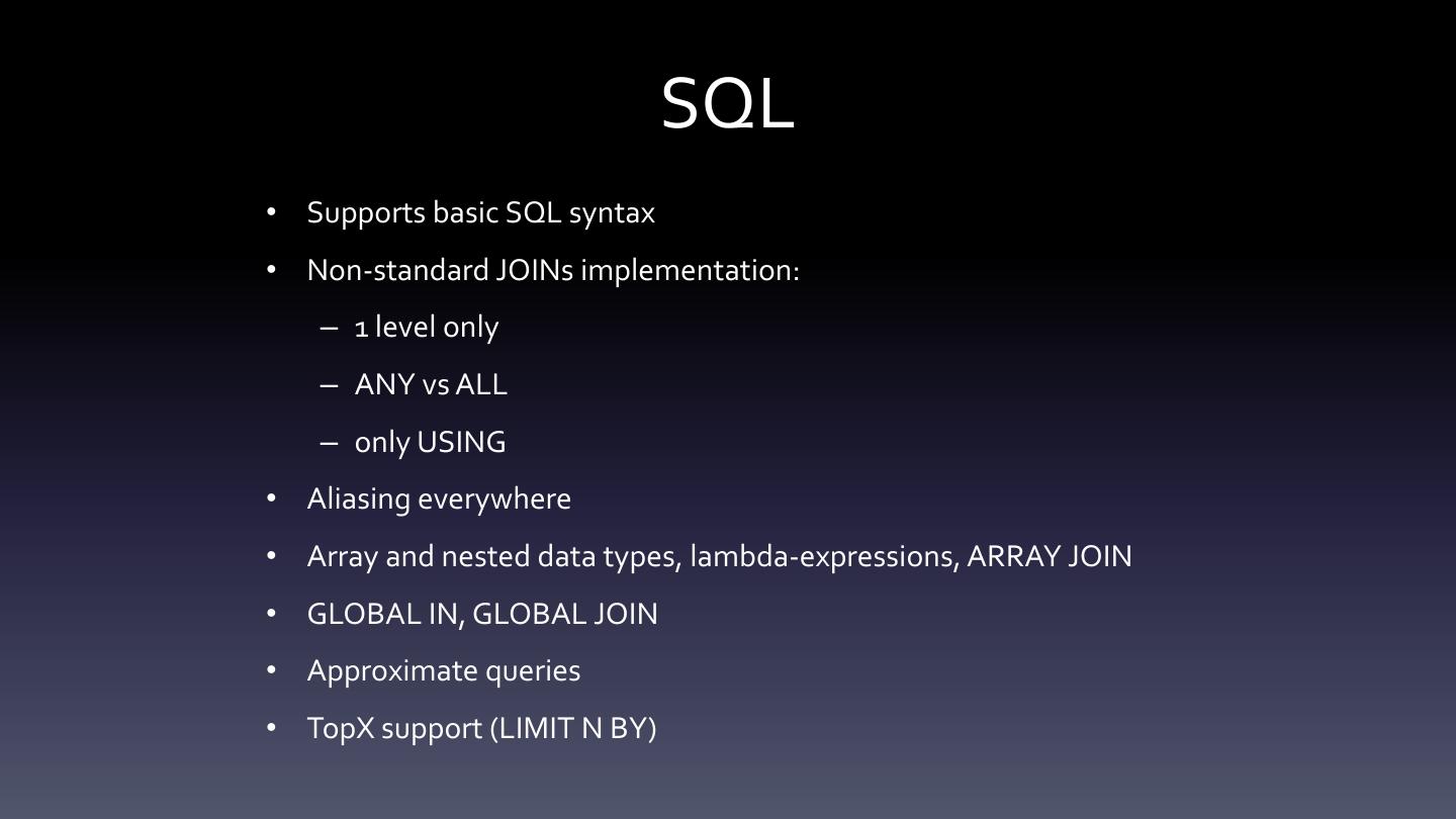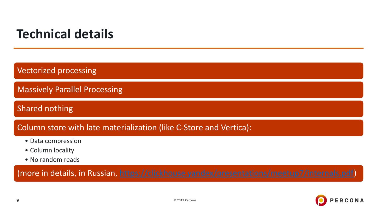 9 .Technical details Vectorized processing Massively Parallel Processing Shared nothing Column store with late materialization (like C-Store and Vertica): • Data compression • Column locality • No random reads (more in details, in Russian, https://clickhouse.yandex/presentations/meetup7/internals.pdf) 9 © 2017 Percona