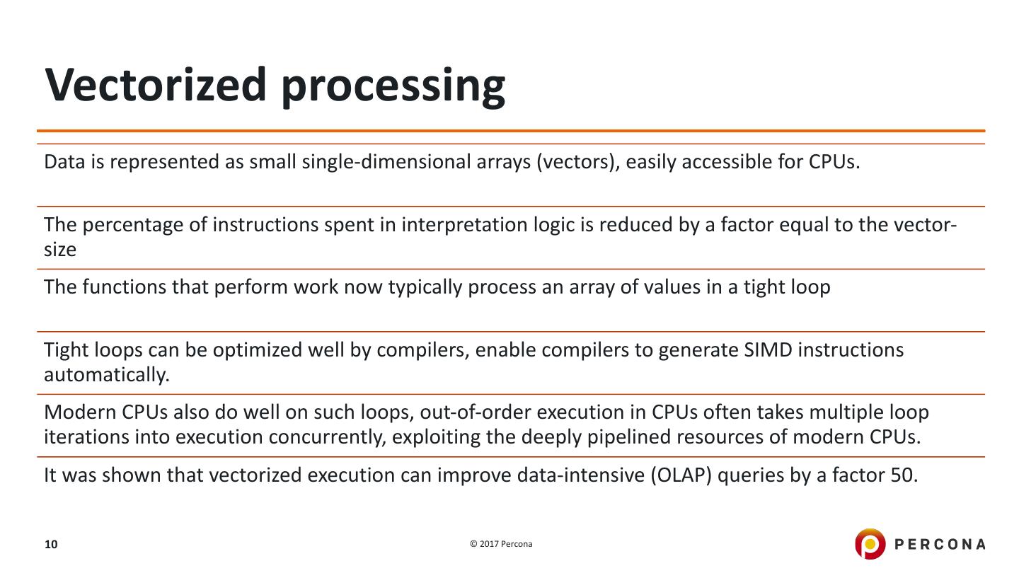 10 .Vectorized processing Data is represented as small single-dimensional arrays (vectors), easily accessible for CPUs. The percentage of instructions spent in interpretation logic is reduced by a factor equal to the vector- size The functions that perform work now typically process an array of values in a tight loop Tight loops can be optimized well by compilers, enable compilers to generate SIMD instructions automatically. Modern CPUs also do well on such loops, out-of-order execution in CPUs often takes multiple loop iterations into execution concurrently, exploiting the deeply pipelined resources of modern CPUs. It was shown that vectorized execution can improve data-intensive (OLAP) queries by a factor 50. 10 © 2017 Percona