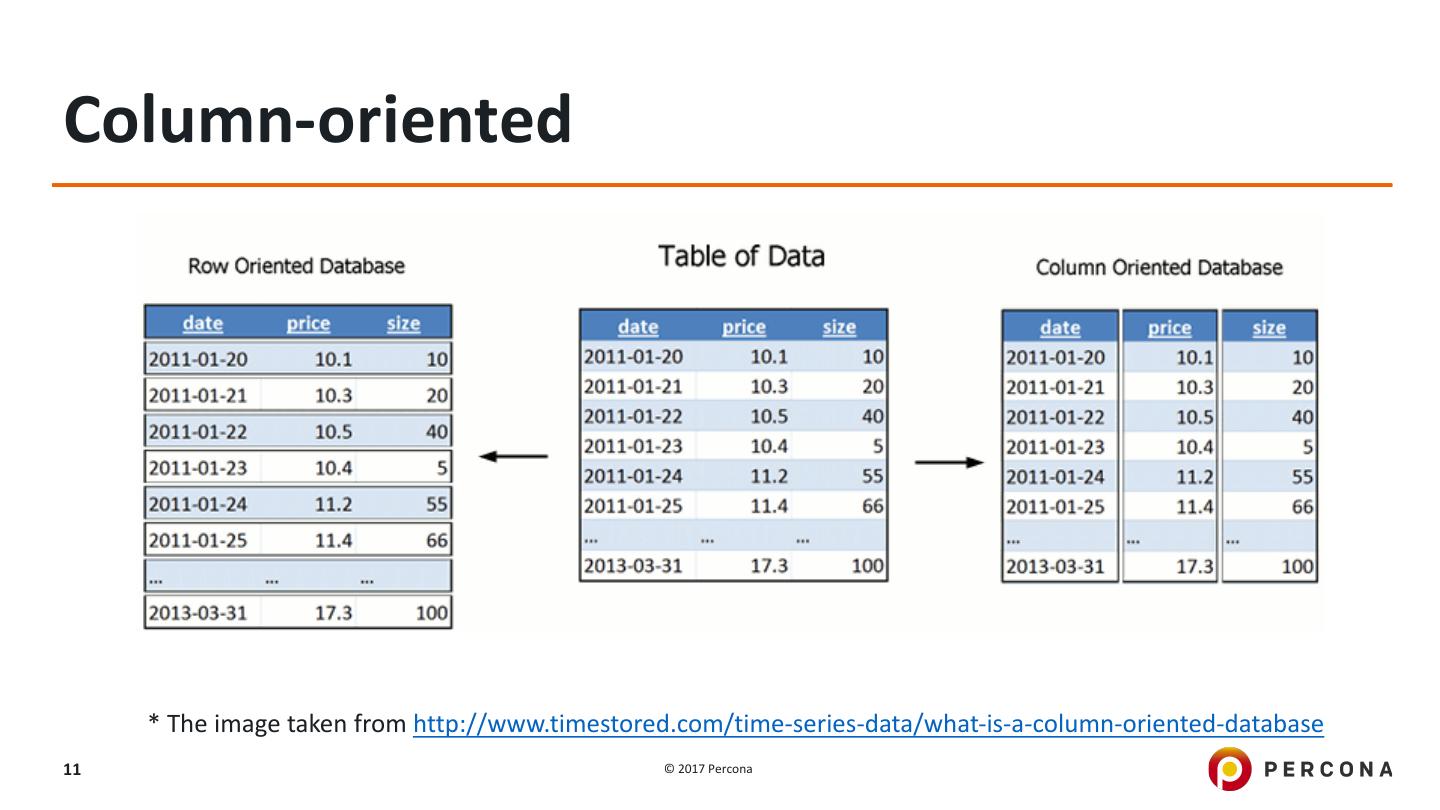 11 .Column-oriented * The image taken from http://www.timestored.com/time-series-data/what-is-a-column-oriented-database 11 © 2017 Percona