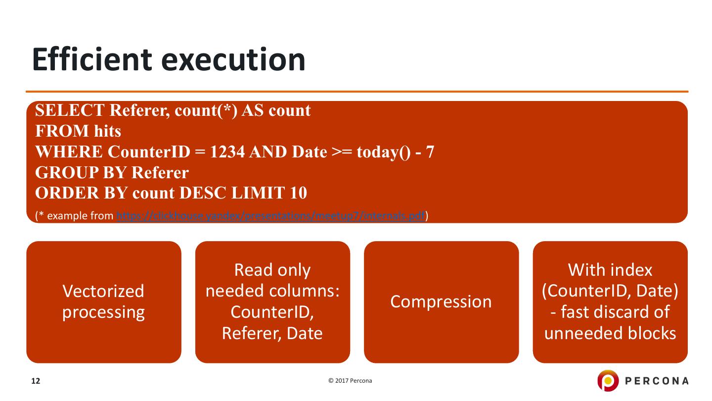 12 .Efficient execution SELECT Referer, count(*) AS count FROM hits WHERE CounterID = 1234 AND Date >= today() - 7 GROUP BY Referer ORDER BY count DESC LIMIT 10 (* example from https://clickhouse.yandex/presentations/meetup7/internals.pdf) Read only With index Vectorized needed columns: (CounterID, Date) Compression processing CounterID, - fast discard of Referer, Date unneeded blocks 12 © 2017 Percona