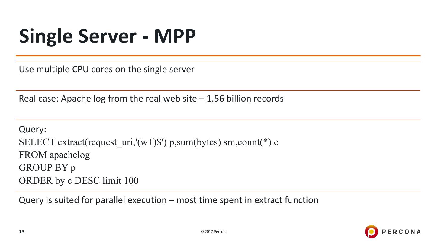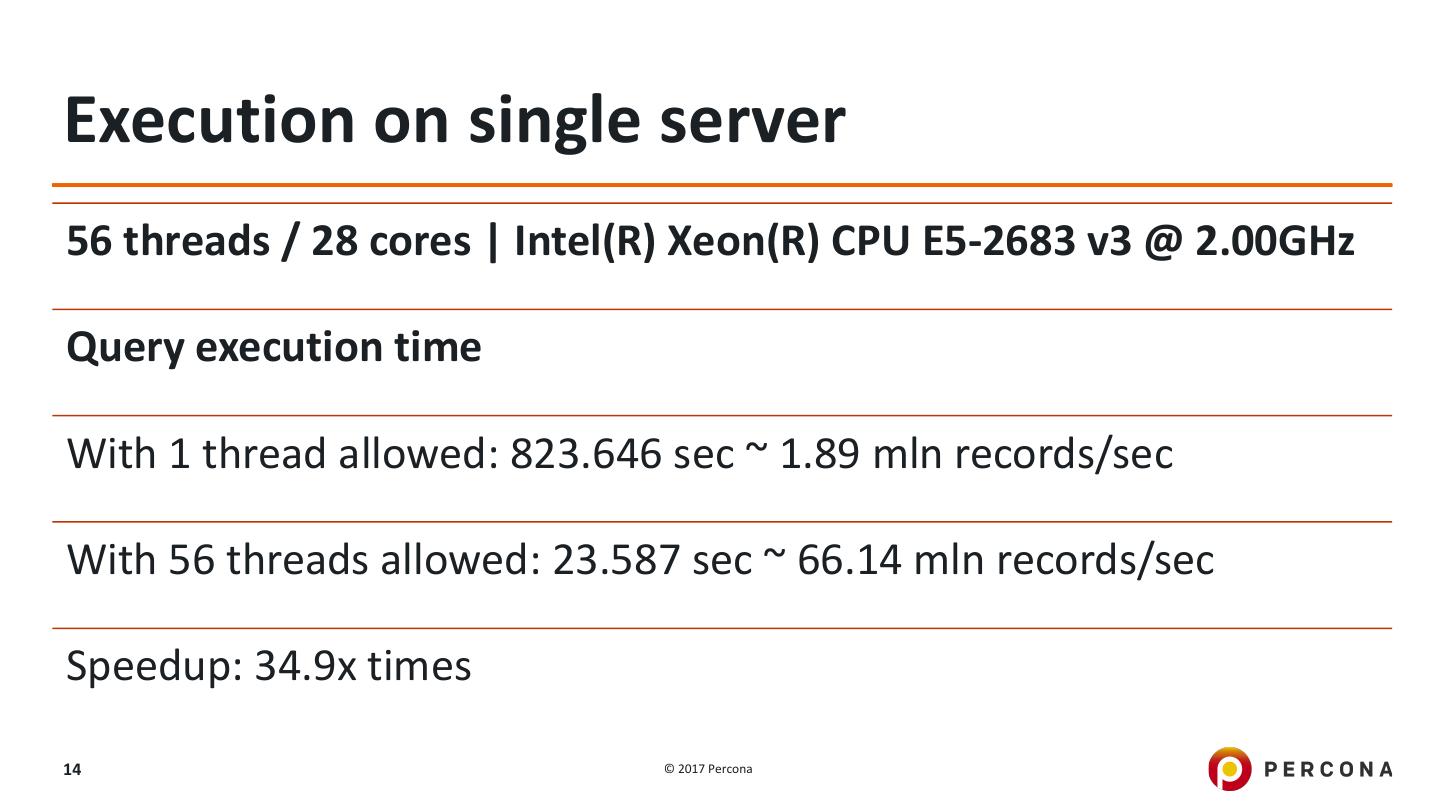 13 .Single Server - MPP Use multiple CPU cores on the single server Real case: Apache log from the real web site – 1.56 billion records Query: SELECT extract(request_uri,'(w+)$') p,sum(bytes) sm,count(*) c FROM apachelog GROUP BY p ORDER by c DESC limit 100 Query is suited for parallel execution – most time spent in extract function 13 © 2017 Percona