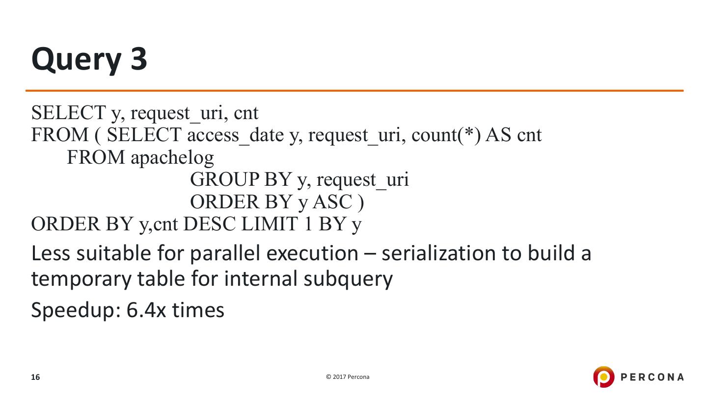 16 .Query 3 SELECT y, request_uri, cnt FROM ( SELECT access_date y, request_uri, count(*) AS cnt FROM apachelog GROUP BY y, request_uri ORDER BY y ASC ) ORDER BY y,cnt DESC LIMIT 1 BY y Less suitable for parallel execution – serialization to build a temporary table for internal subquery Speedup: 6.4x times 16 © 2017 Percona