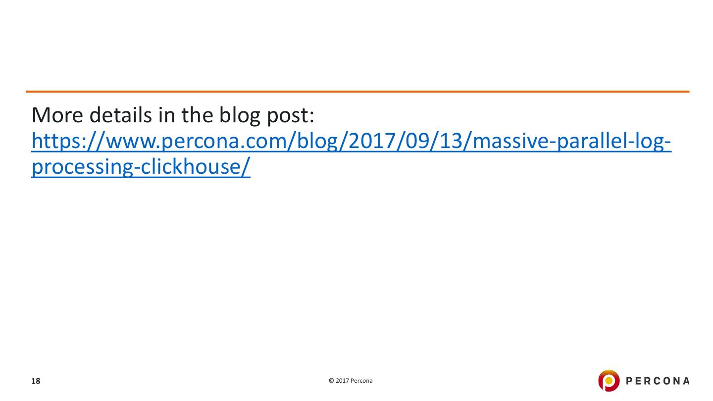 18 .More details in the blog post: https://www.percona.com/blog/2017/09/13/massive-parallel-log- processing-clickhouse/ 18 © 2017 Percona