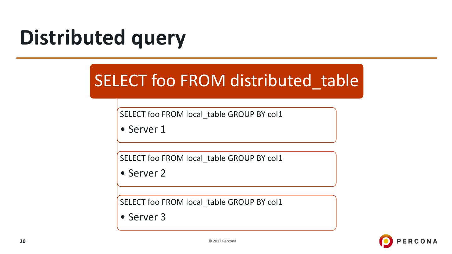 20 .Distributed query SELECT foo FROM distributed_table SELECT foo FROM local_table GROUP BY col1 • Server 1 SELECT foo FROM local_table GROUP BY col1 • Server 2 SELECT foo FROM local_table GROUP BY col1 • Server 3 20 © 2017 Percona