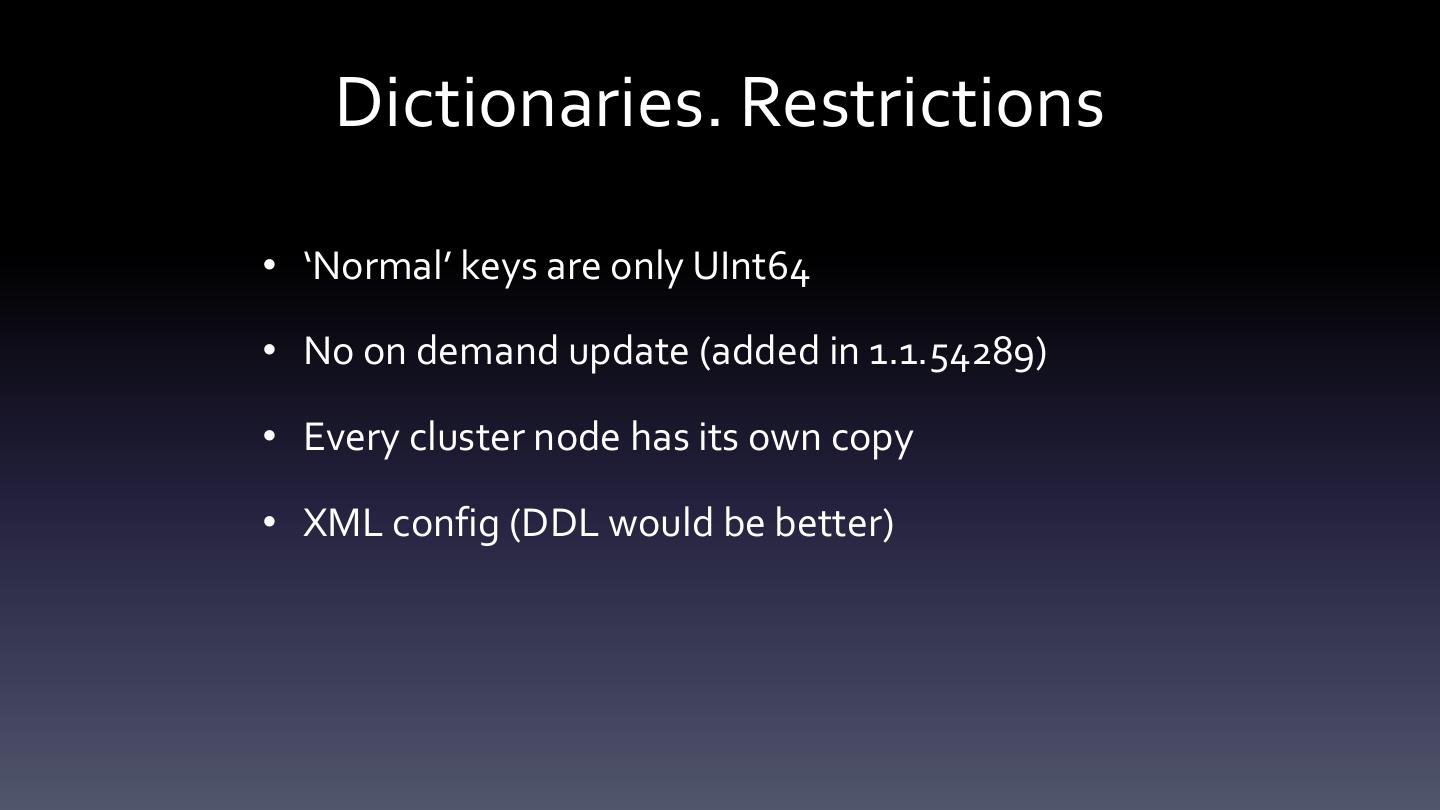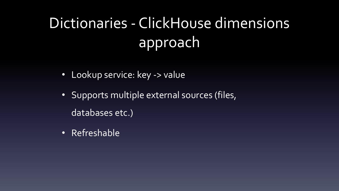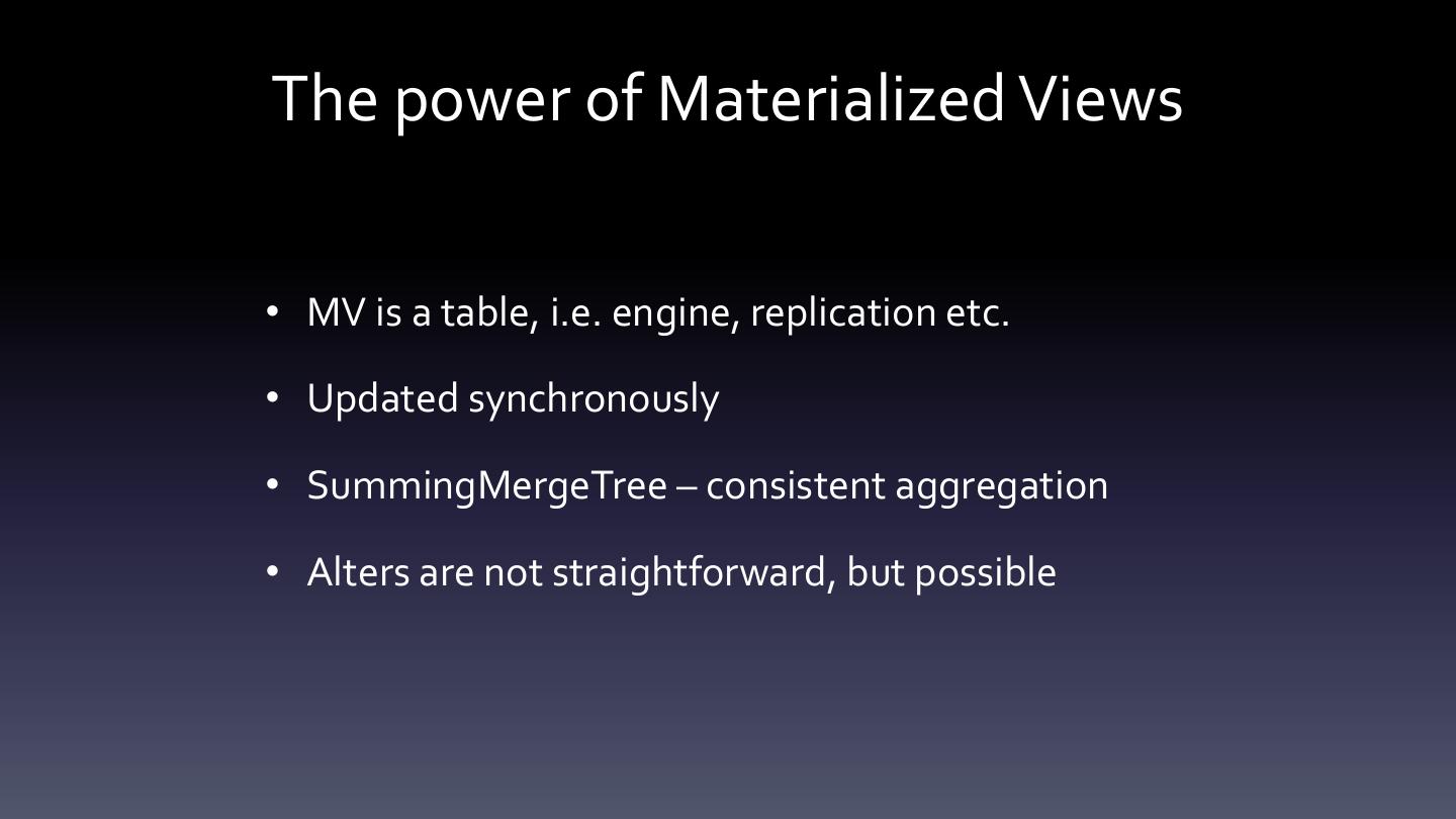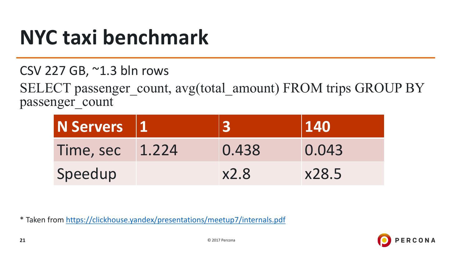 21 .NYC taxi benchmark CSV 227 GB, ~1.3 bln rows SELECT passenger_count, avg(total_amount) FROM trips GROUP BY passenger_count N Servers 1 3 140 Time, sec 1.224 0.438 0.043 Speedup x2.8 x28.5 * Taken from https://clickhouse.yandex/presentations/meetup7/internals.pdf 21 © 2017 Percona