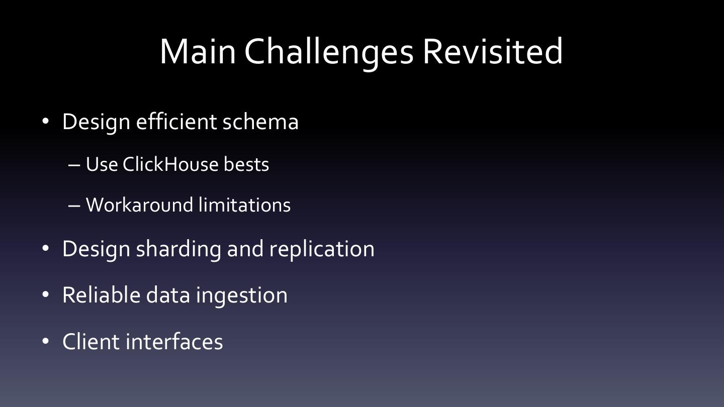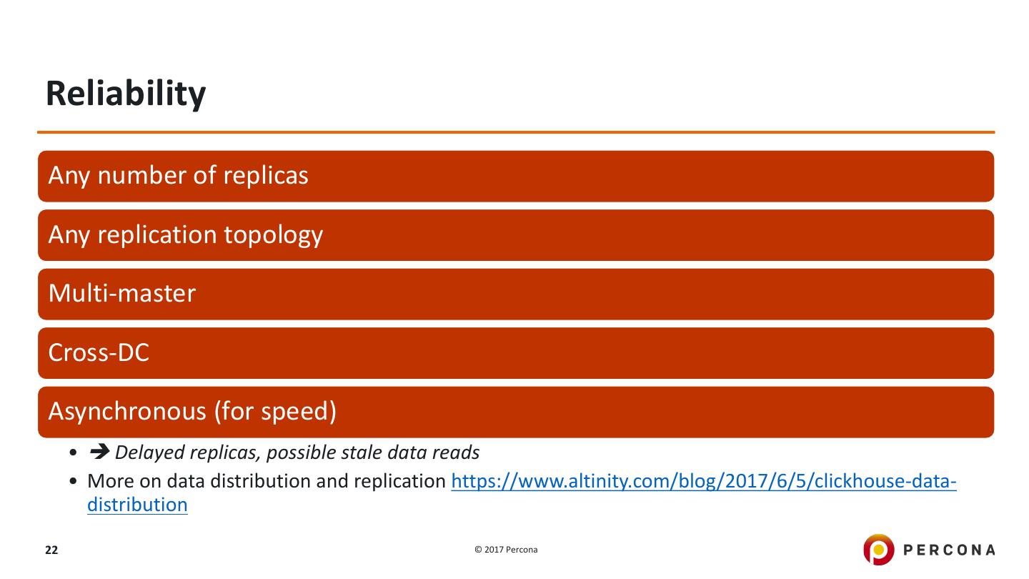 22 .Reliability Any number of replicas Any replication topology Multi-master Cross-DC Asynchronous (for speed) • è Delayed replicas, possible stale data reads • More on data distribution and replication https://www.altinity.com/blog/2017/6/5/clickhouse-data- distribution 22 © 2017 Percona