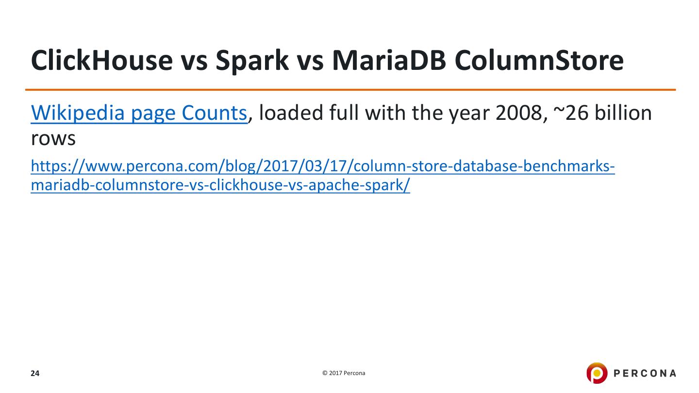 24 .ClickHouse vs Spark vs MariaDB ColumnStore Wikipedia page Counts, loaded full with the year 2008, ~26 billion rows https://www.percona.com/blog/2017/03/17/column-store-database-benchmarks- mariadb-columnstore-vs-clickhouse-vs-apache-spark/ 24 © 2017 Percona
