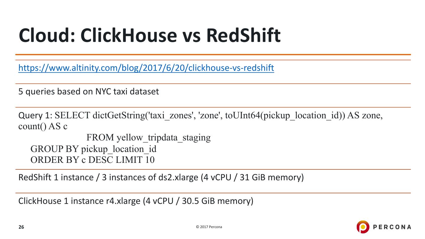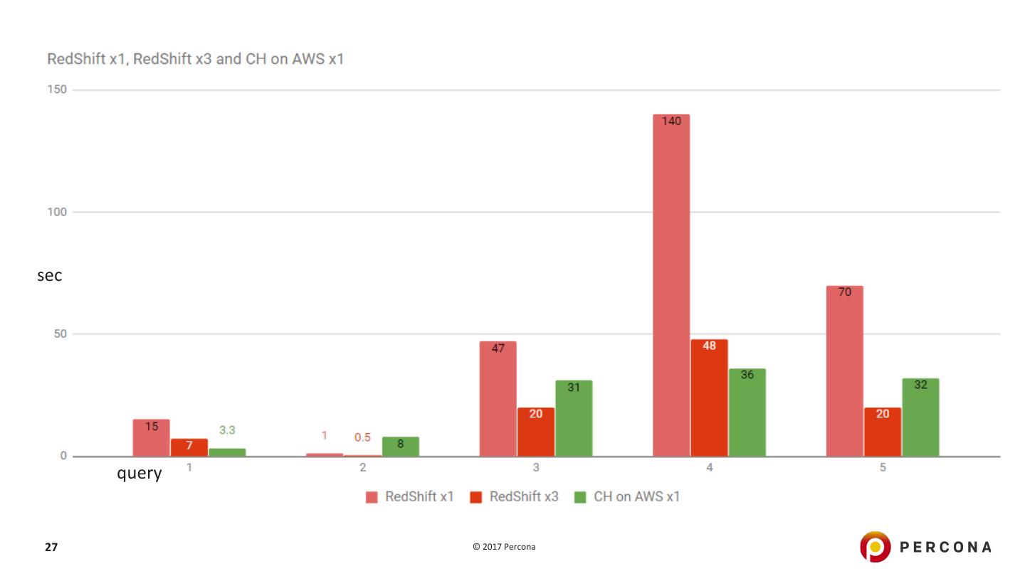 26 .Cloud: ClickHouse vs RedShift https://www.altinity.com/blog/2017/6/20/clickhouse-vs-redshift 5 queries based on NYC taxi dataset Query 1: SELECT dictGetString('taxi_zones', 'zone', toUInt64(pickup_location_id)) AS zone, count() AS c FROM yellow_tripdata_staging GROUP BY pickup_location_id ORDER BY c DESC LIMIT 10 RedShift 1 instance / 3 instances of ds2.xlarge (4 vCPU / 31 GiB memory) ClickHouse 1 instance r4.xlarge (4 vCPU / 30.5 GiB memory) 26 © 2017 Percona
