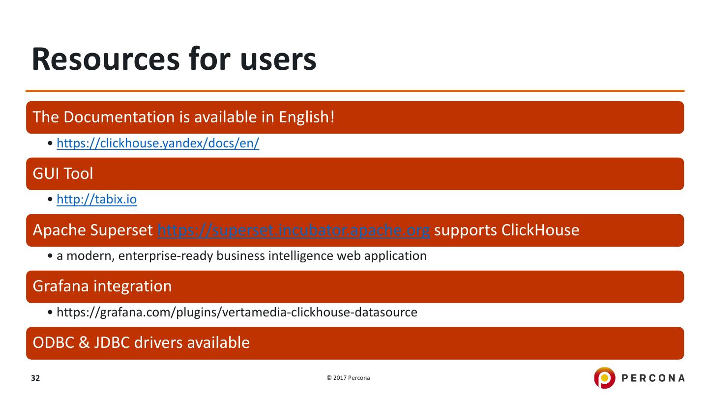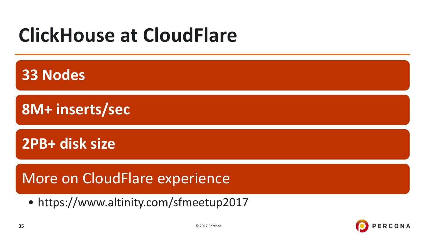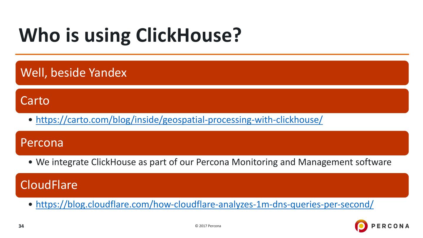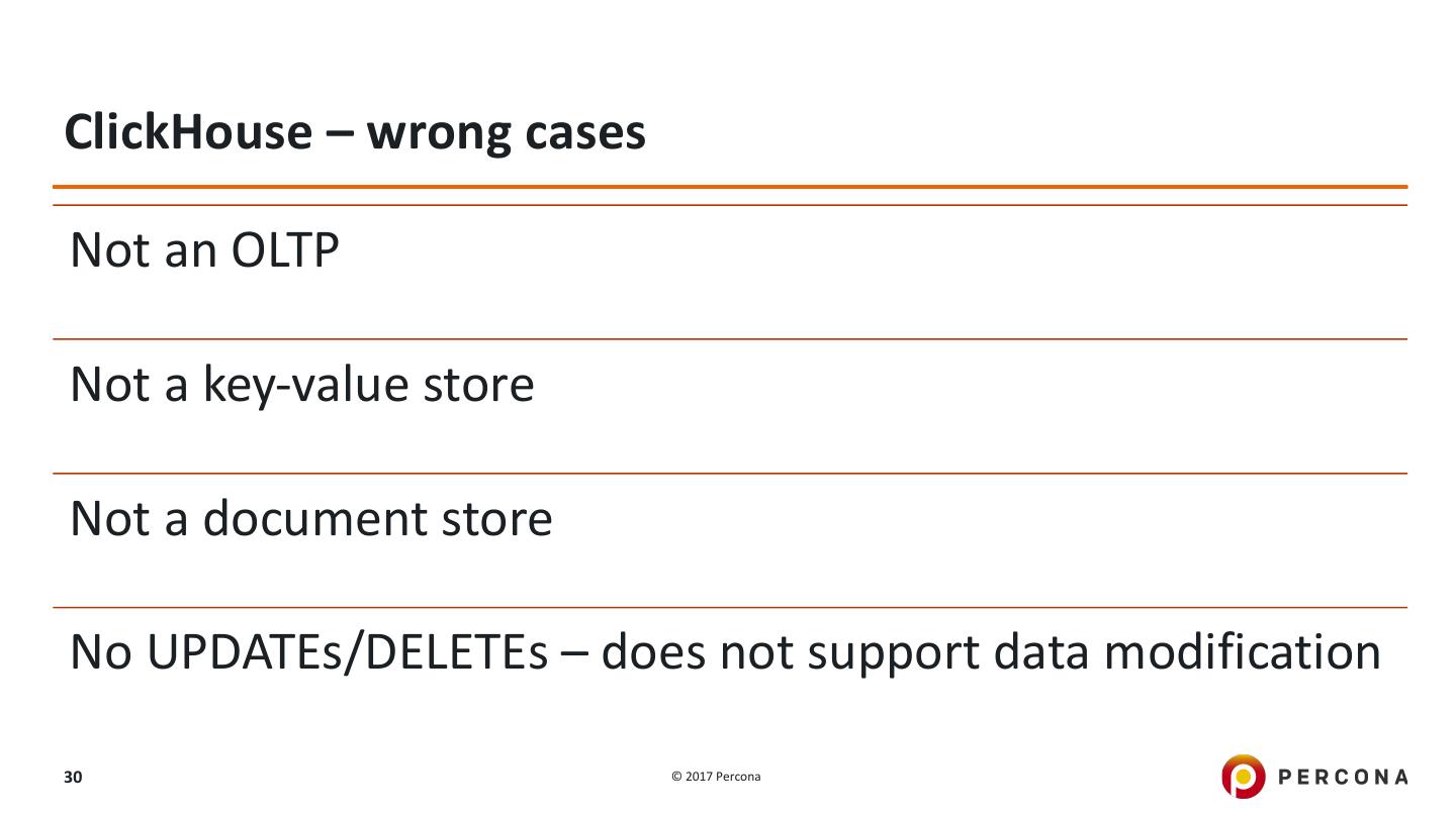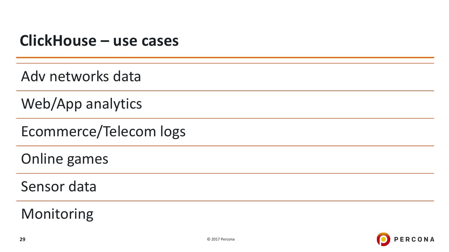 29 .ClickHouse – use cases Adv networks data Web/App analytics Ecommerce/Telecom logs Online games Sensor data Monitoring 29 © 2017 Percona