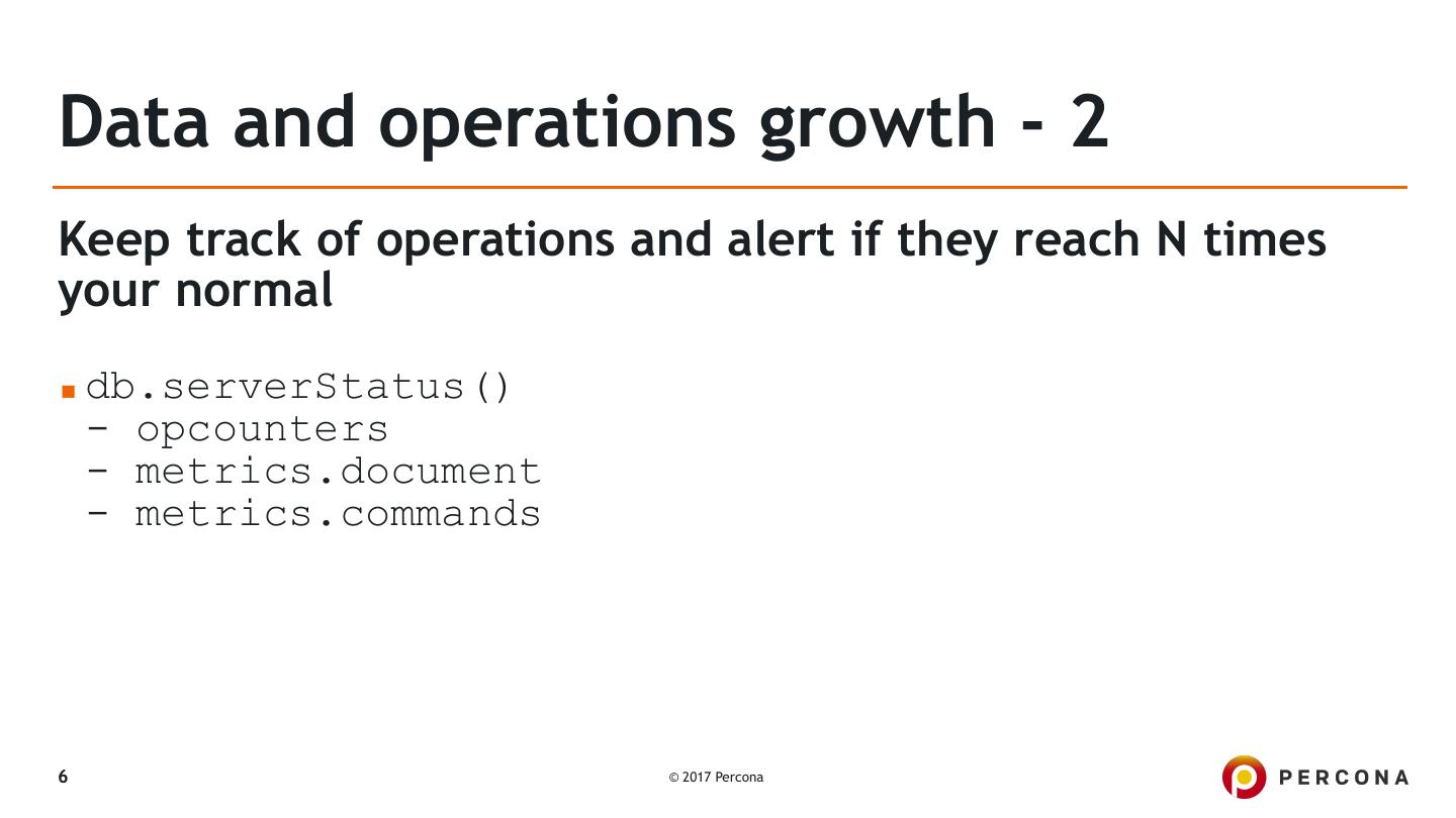 6 .Data and operations growth - 2 Keep track of operations and alert if they reach N times your normal ▪ db.serverStatus() - opcounters - metrics.document - metrics.commands 6 © 2017 Percona